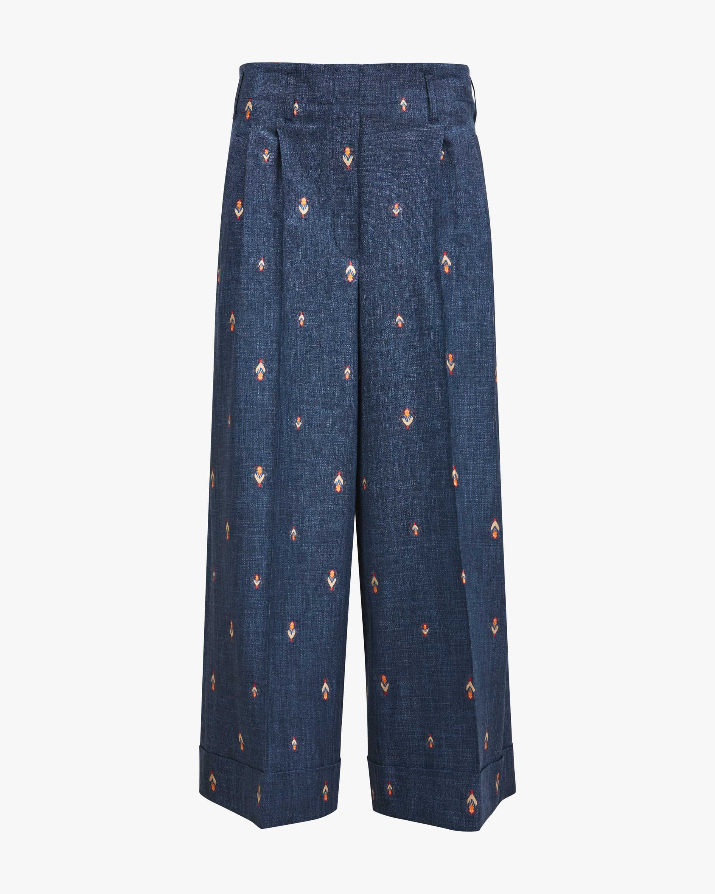 Women's culottes from Maison Common in blue and colorful. The label embodies joie de vivre and esprit, which are reflected in the collections alongside feminine designs and patterns in the collections. The cropped model thanks to the virgin wool blend in chambray fabric and the wide cut with comfortable wearing comfort and a fashionable denim look, while the colorful while the colorful ornamental embroidery adds a special touch.