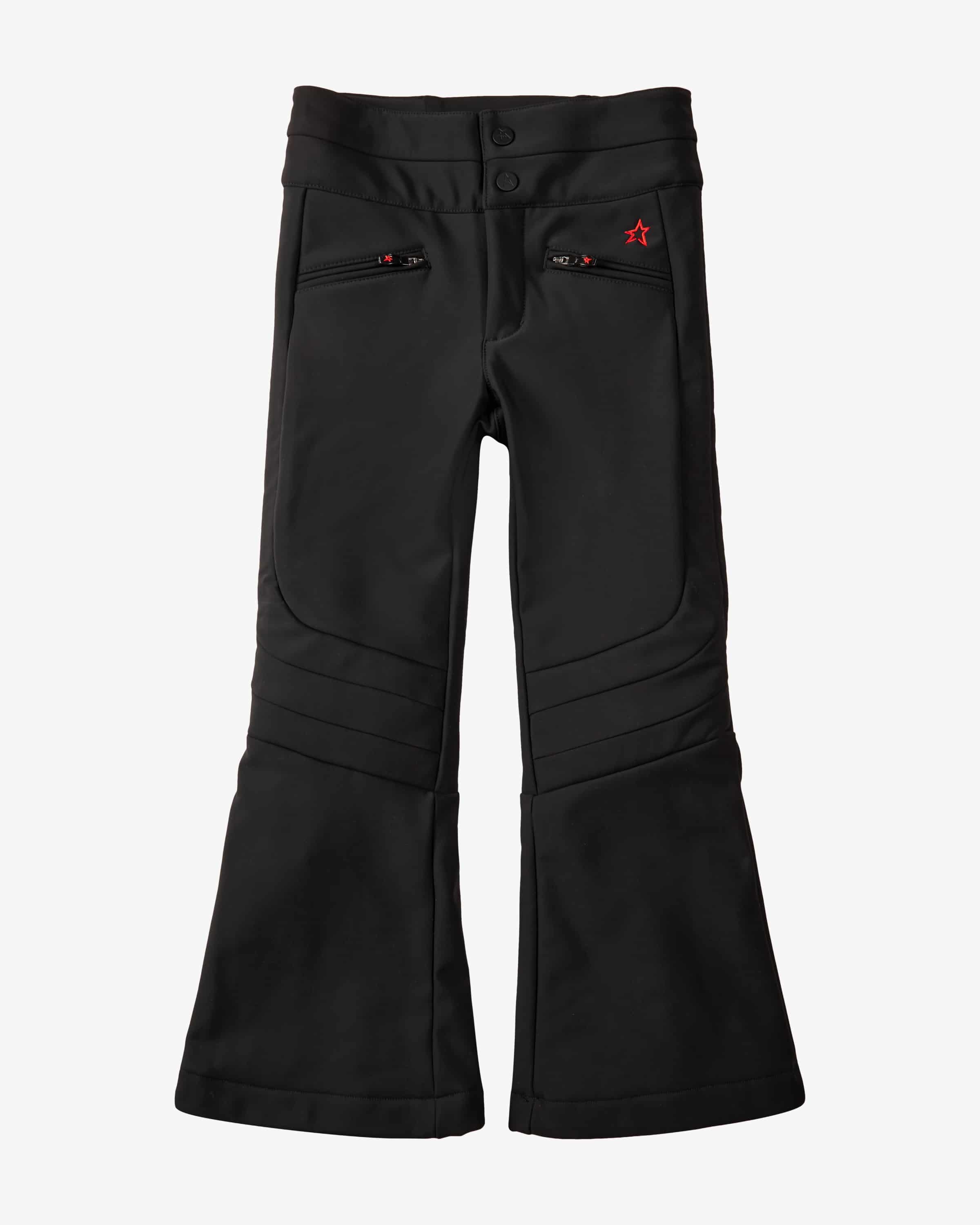 Aurora High Waist Flare ski pants for children from Perfect Moment in black. For stylish ski looks - thanks to the slim cut, this model is a fashionable eye-catcher on the a fashionable eye-catcher on the slopes, while the fit can be individually can be individually adjusted thanks to the zippers at the leg ends. The functional details and the elasticated insert on the waistband complete the the sporty overall look.