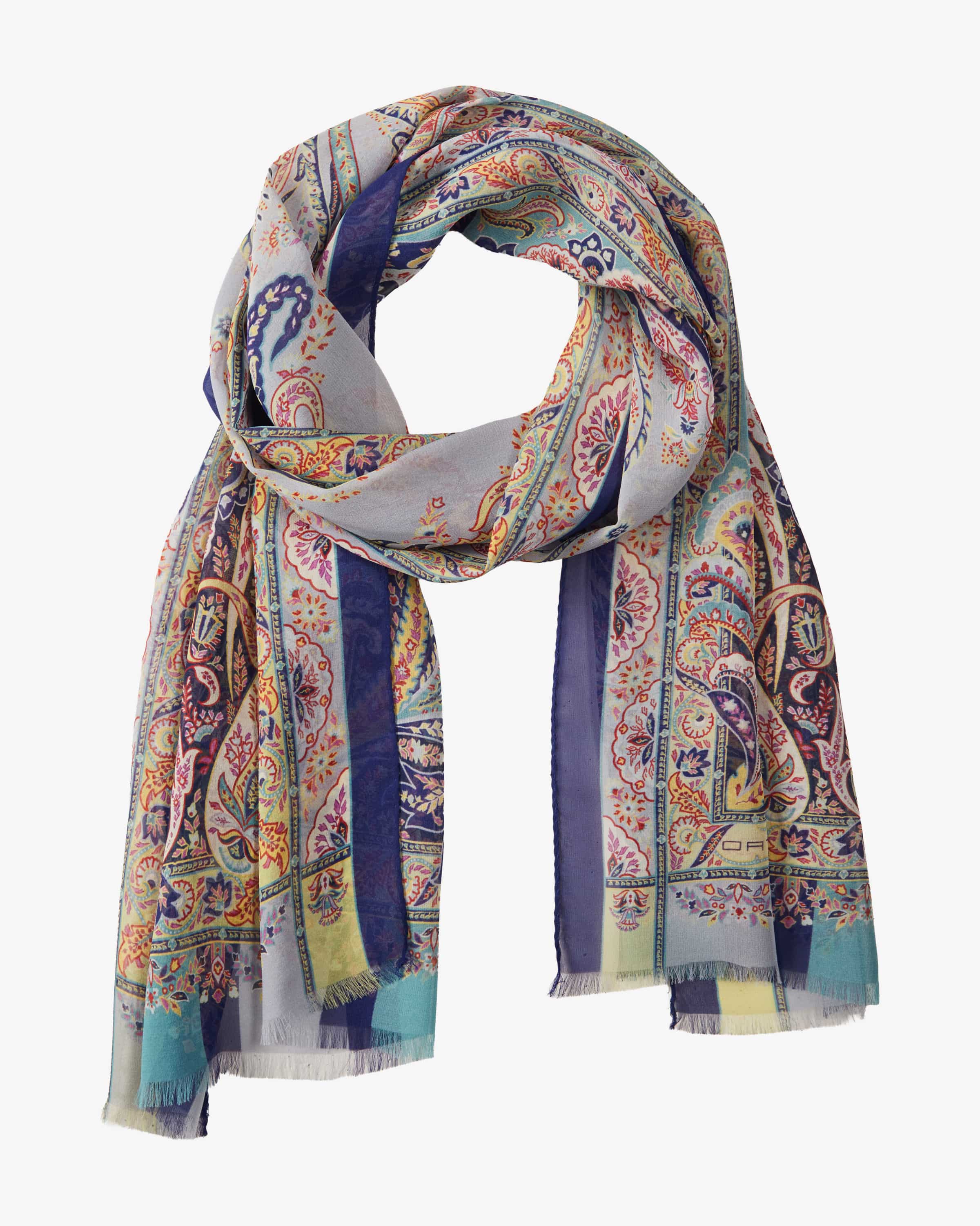 Silk scarf for women from Etro in blue, lilac and lemon. While the colorful paisley pattern creates a stylish eye-catcher, the pure silk quality in a semi-transparent silk quality in a semi-transparent look ensures a pleasantly light comfortable to wear.
