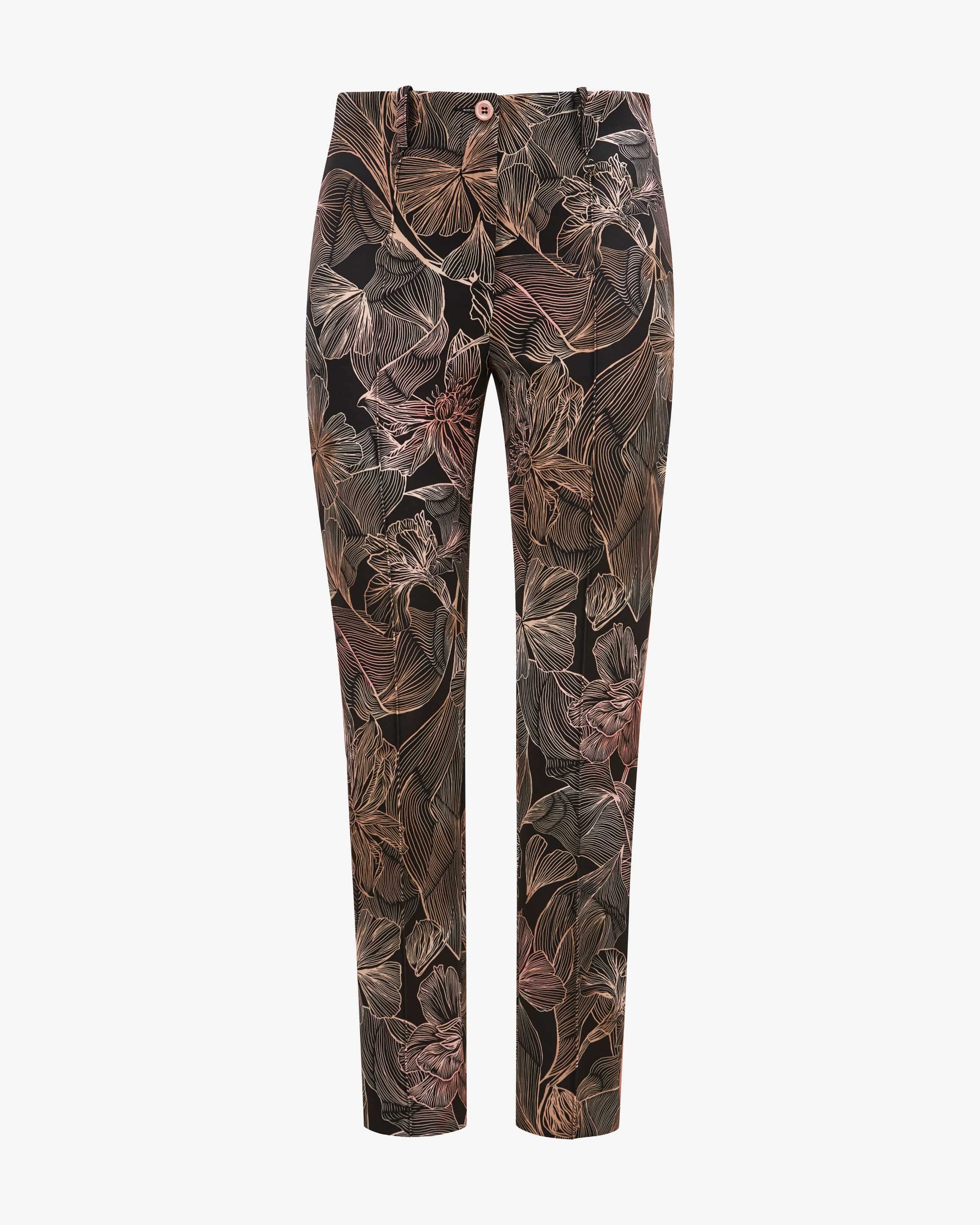 Pants Sydney Regular Waist Slim Fit for women by Marc Cain in black, pink and beige. beige. The German brand stands for confident, feminine looks. This model also features an all-over floral print and narrow piping, while the stretchy material ensures optimum comfort.