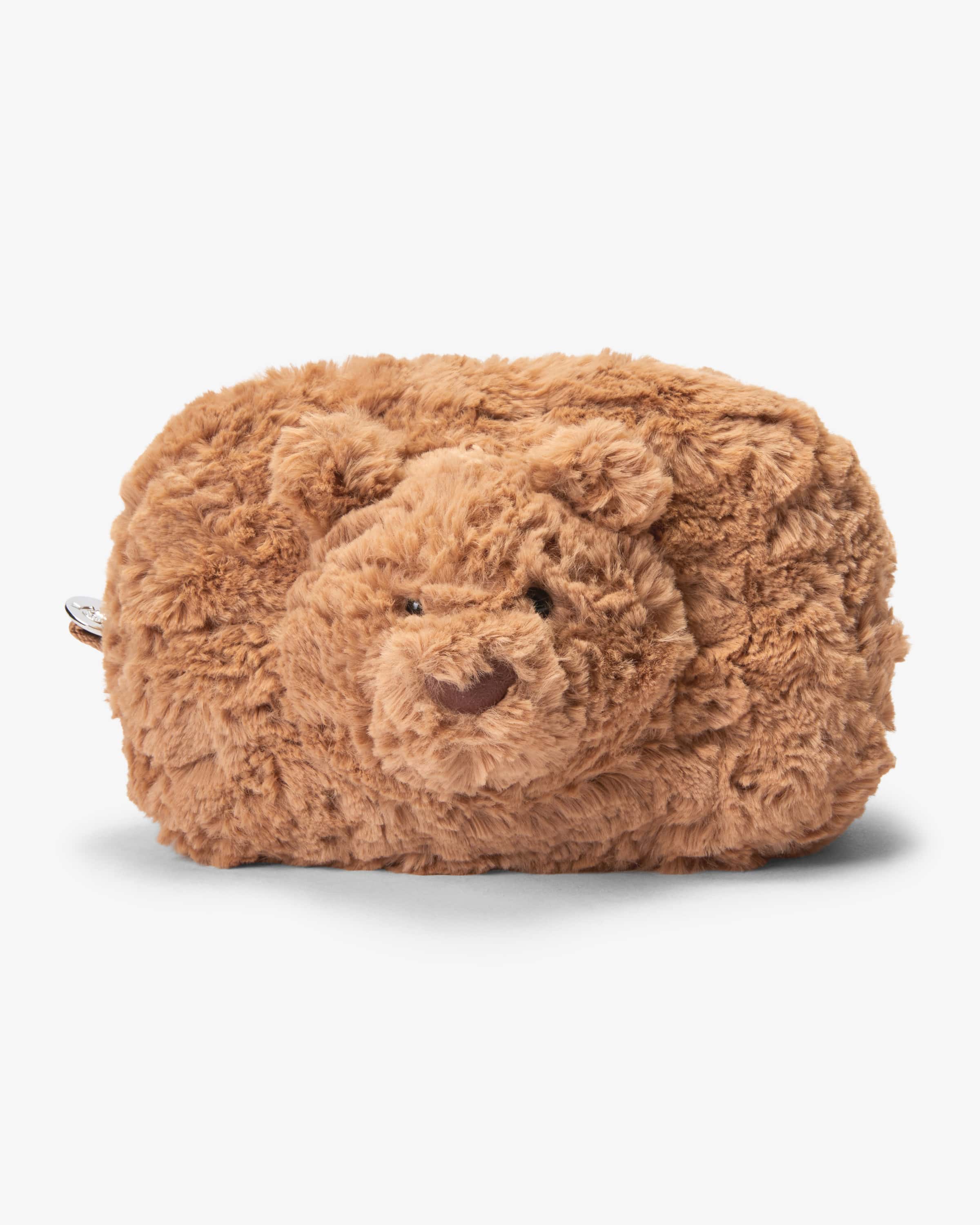 Bartholomew Bear Pouch for children from Jellycat in light brown. The label, which has