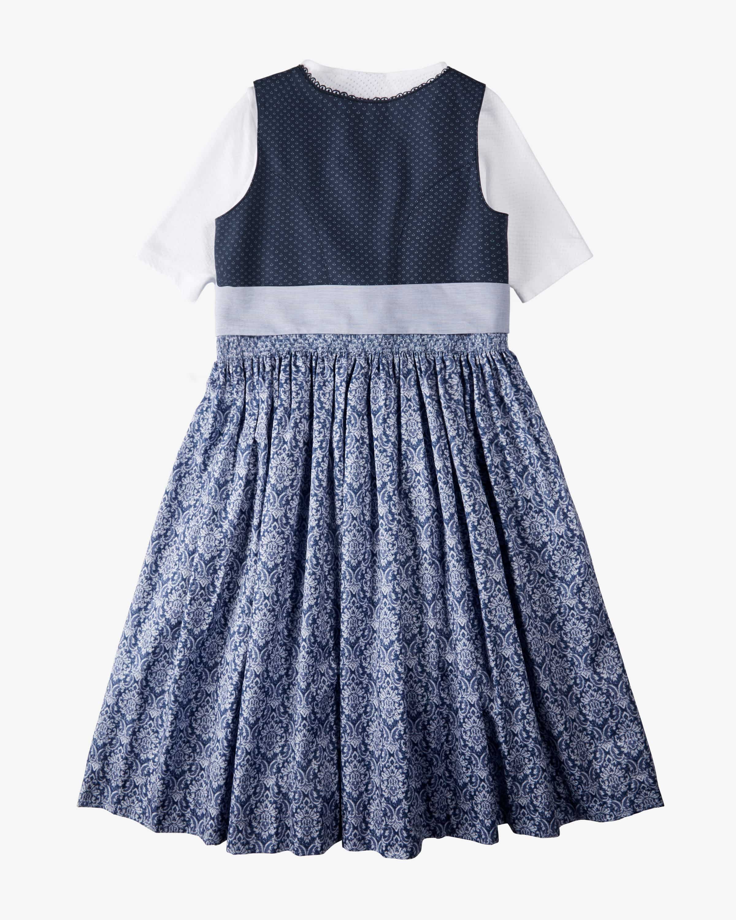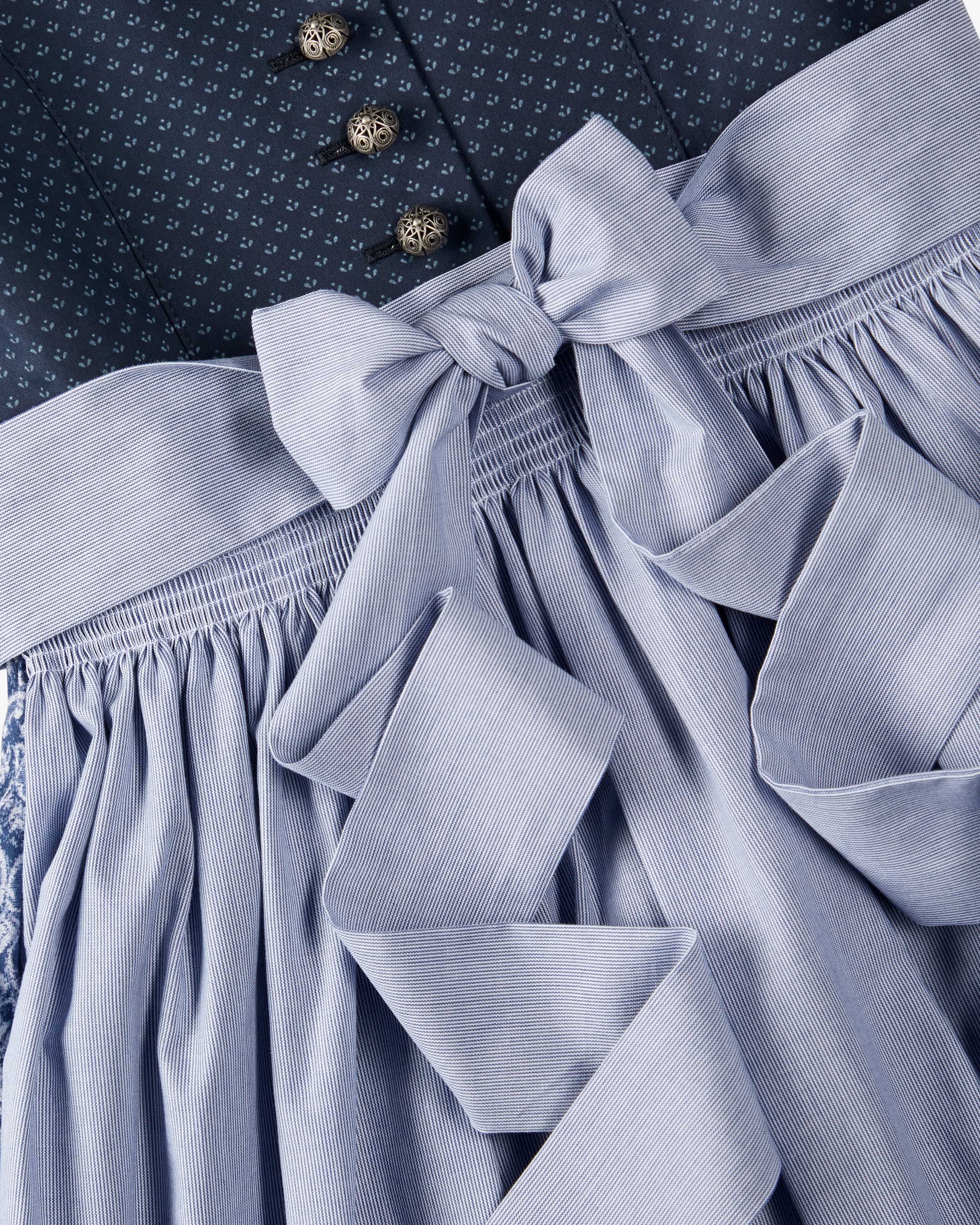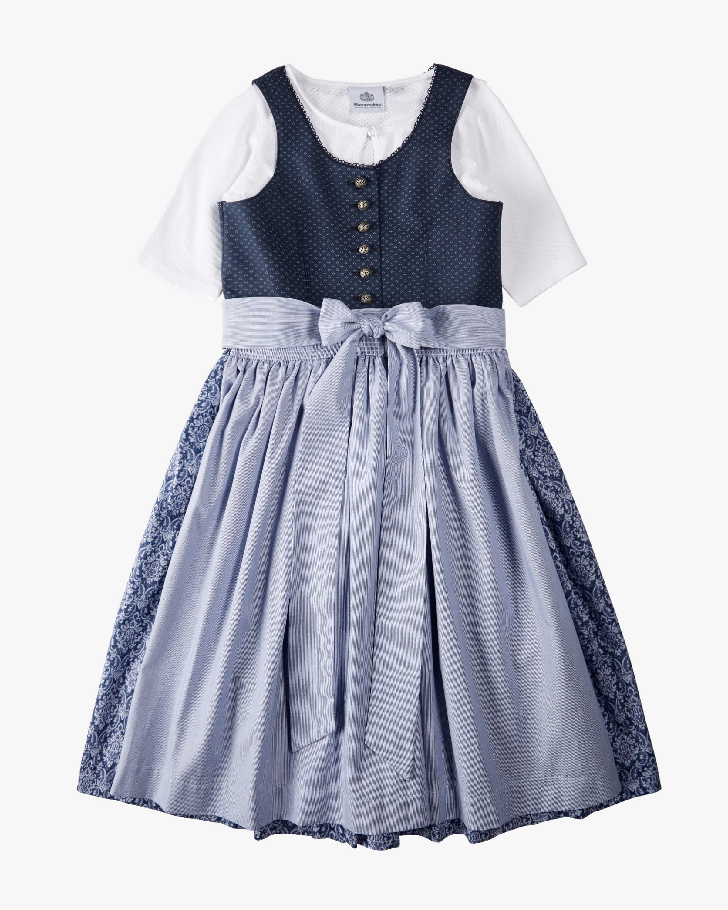 Bergsee dirndl with blouse and apron for girls from Hammerschmid in navy, blue and white. The cotton model features a subtle floral print on the top and a stylish in the top and a stylish ornamental pattern in the flared skirt, while traditional details traditional details and the striped apron skilfully round off the overall look. round off the overall look.