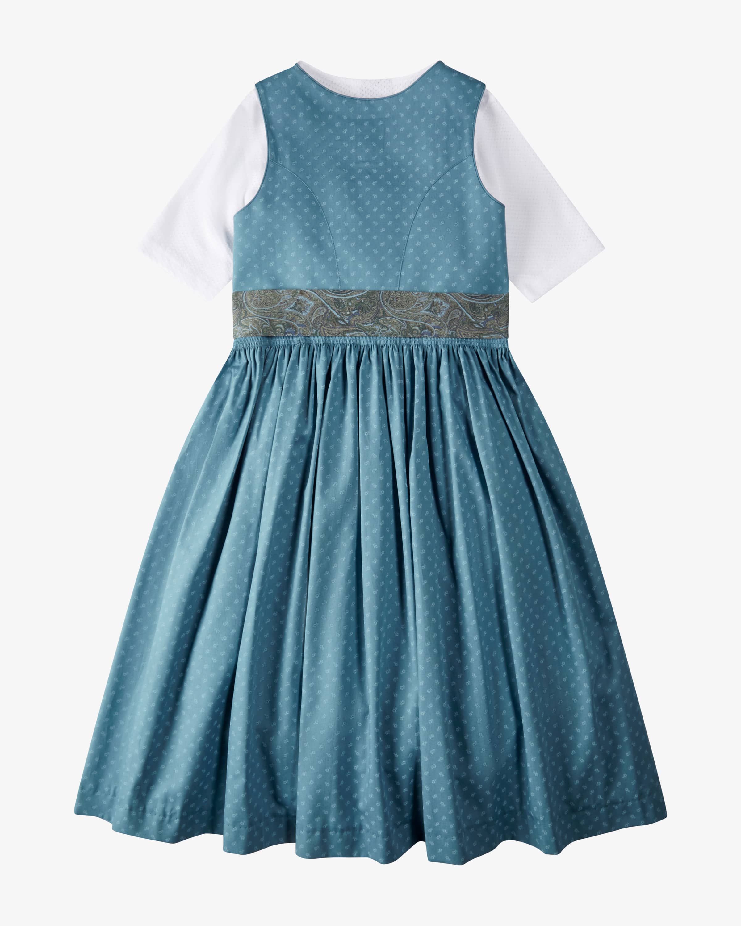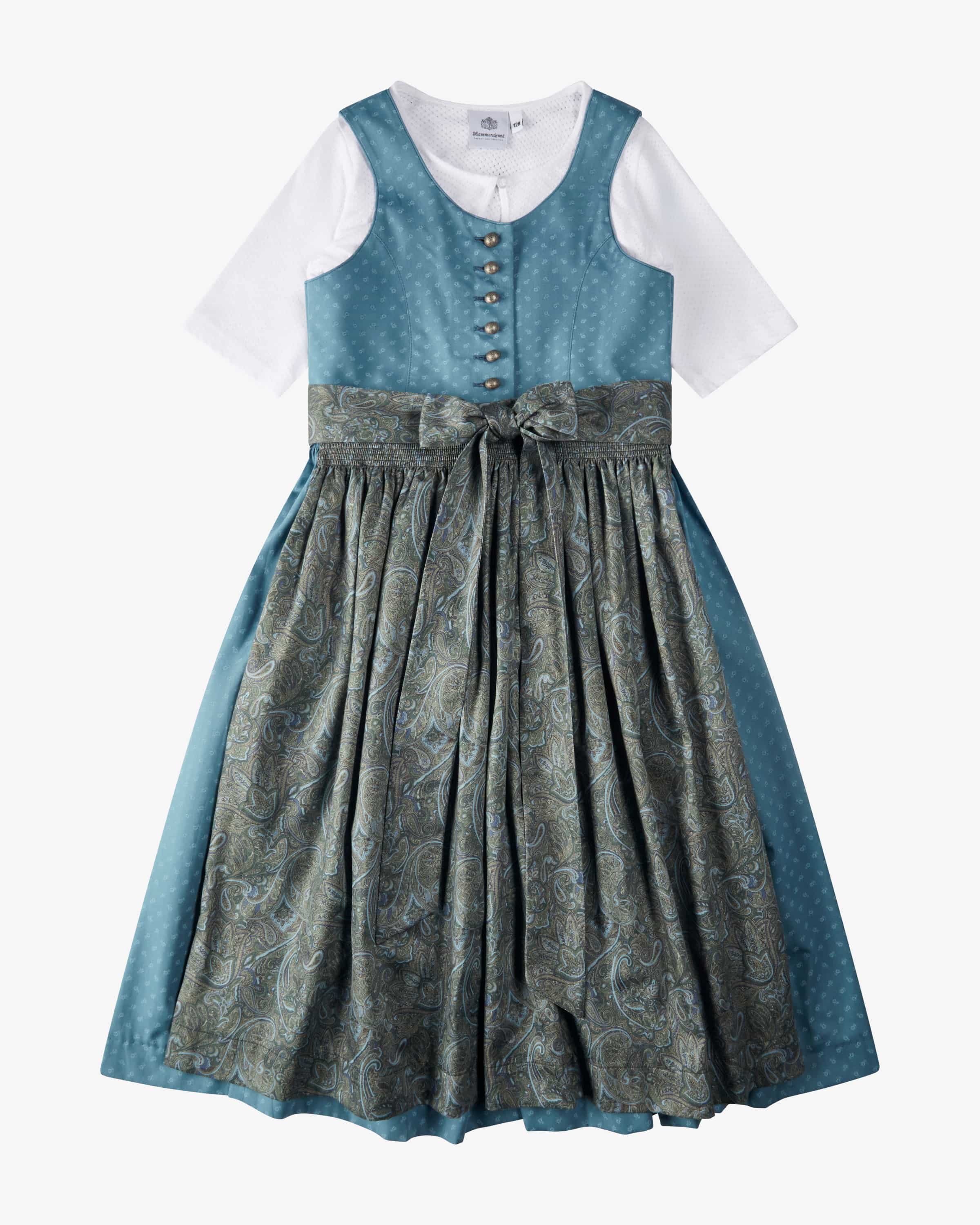 Bergsee dirndl with blouse and apron for girls by Hammerschmid in petrol, olive and white. Thanks to the classic cut and the all-over floral design, the model has a traditional look. At the same time, the apron with playful paisley pattern sets visual highlights and rounds off the traditional the overall look.