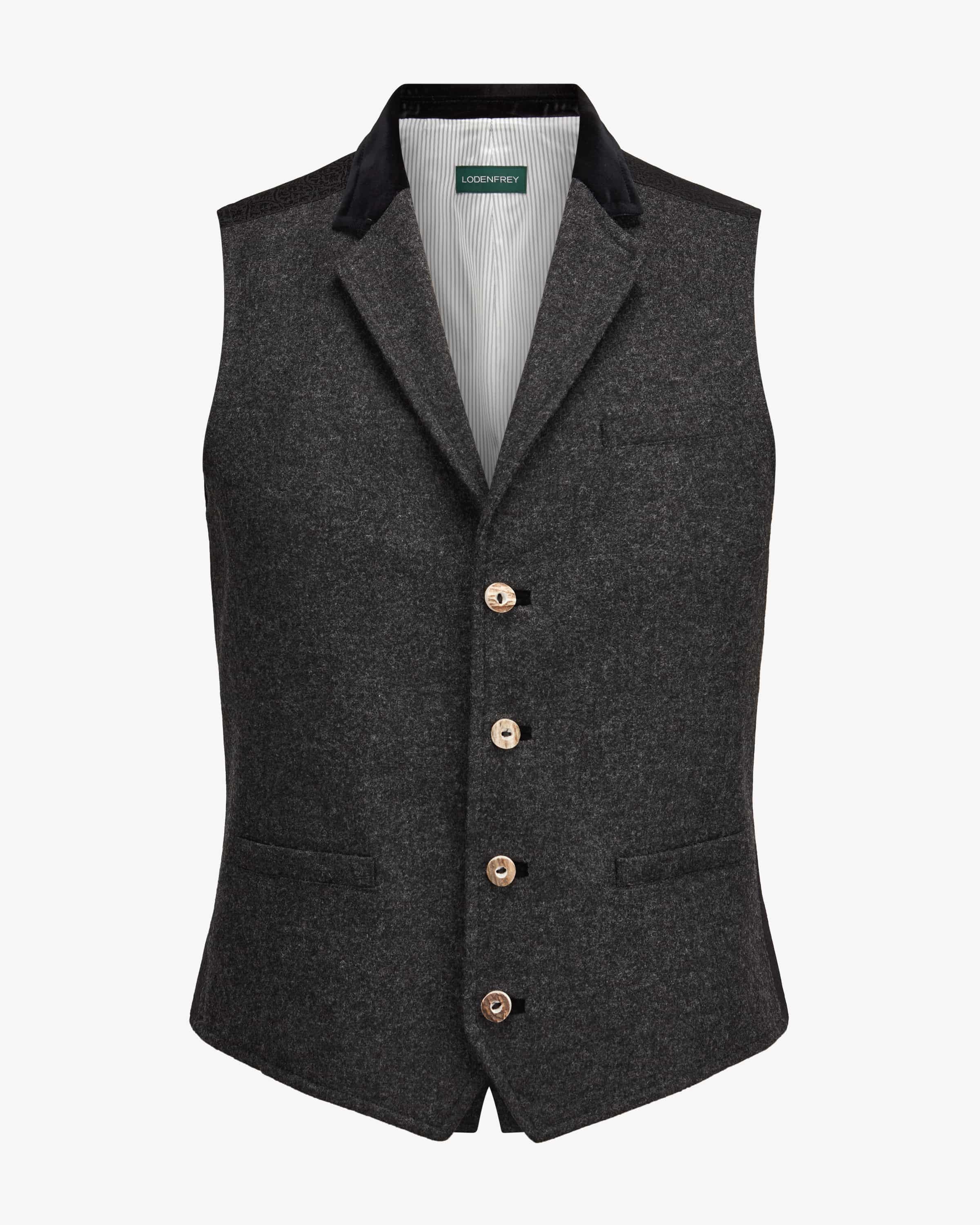 Brückl traditional vest for men from LODENFREY in anthracite and black. The model features a fine jacquard pattern on the back for a traditional and traditional and elegant look. The soft velvet piping and classic classic details skilfully round off the elegant traditional look.