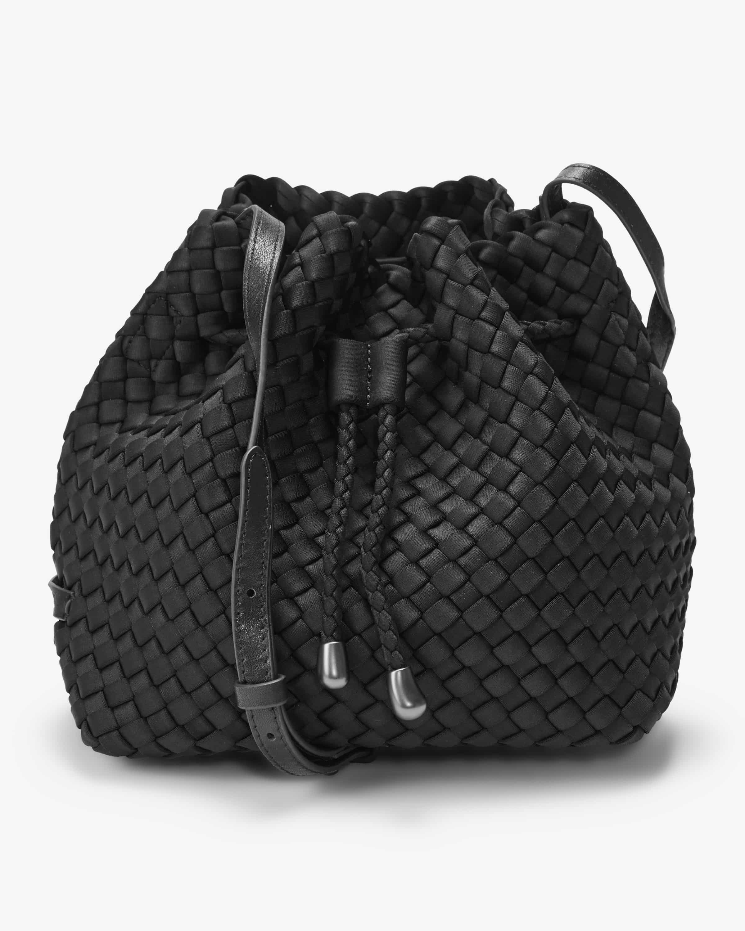 Gramercy Medium Bucket shoulder bag for women from Naghedi in black. This textile model presents itself in a subtly iridescent look and elegant braided design, while the bucket design with drawstring fastening creates a fashionable companion.