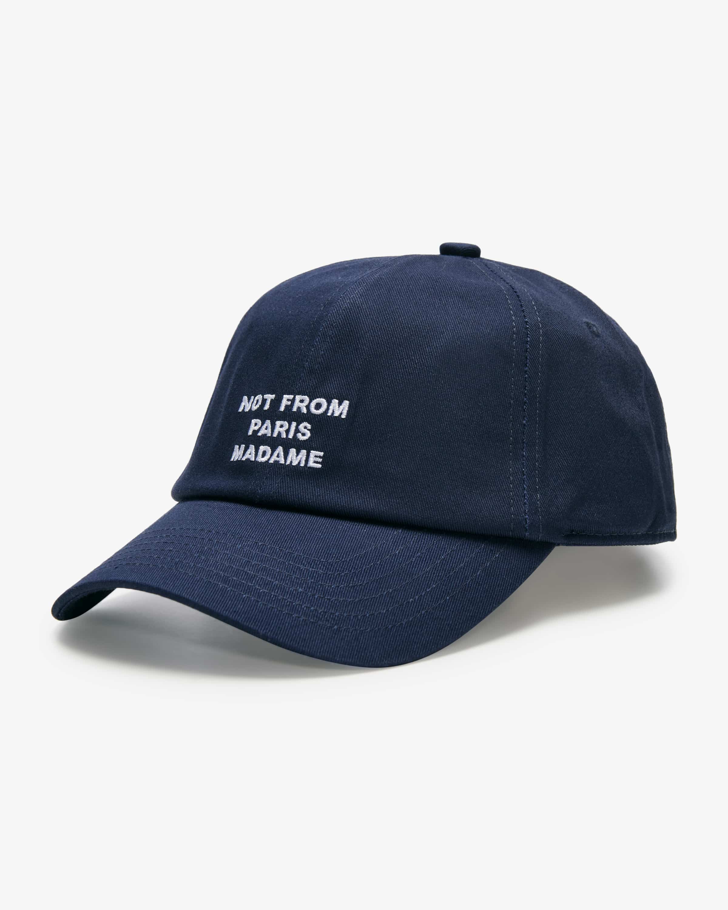 Cap for men from Drole de Monsieur in navy. The label was founded in Dijon in 2014 and stands for unique, wearable designs with a retro-inspired aesthetic. aesthetics. Thanks to its classic baseball shape, this model is a modern favorite with sporty charm, while the striking slogan embroidery skillfully skilfully showcases the fashionable accessory.