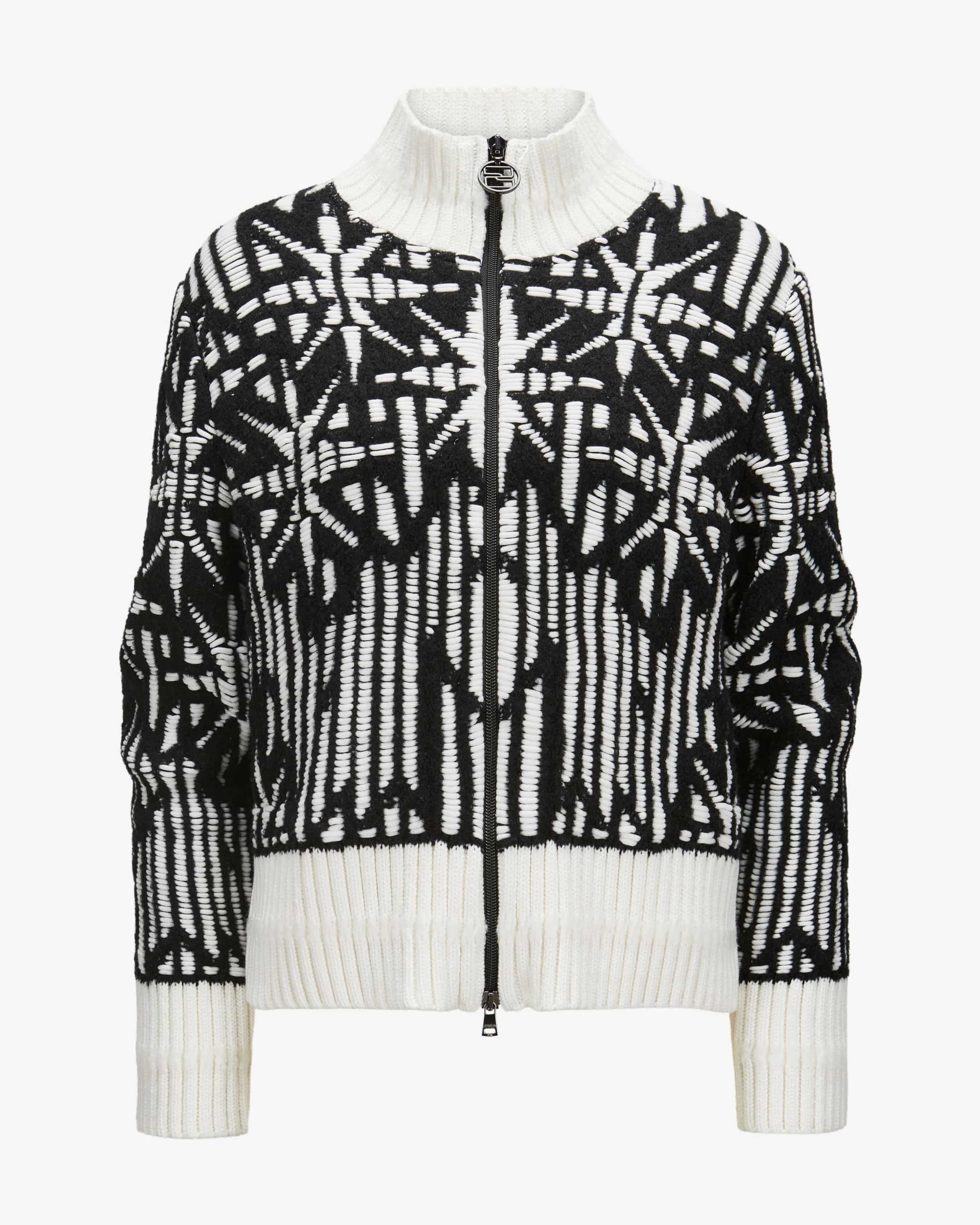 Cardigan for women from Marc Cain in black and white. The German brand stands for confident, feminine looks. This model also features a with a sporty silhouette and soft material blend that guarantees comfortable guaranteed. The graphic knit pattern with a wintery touch skilfully rounds off the design. skilfully rounds off the design.
