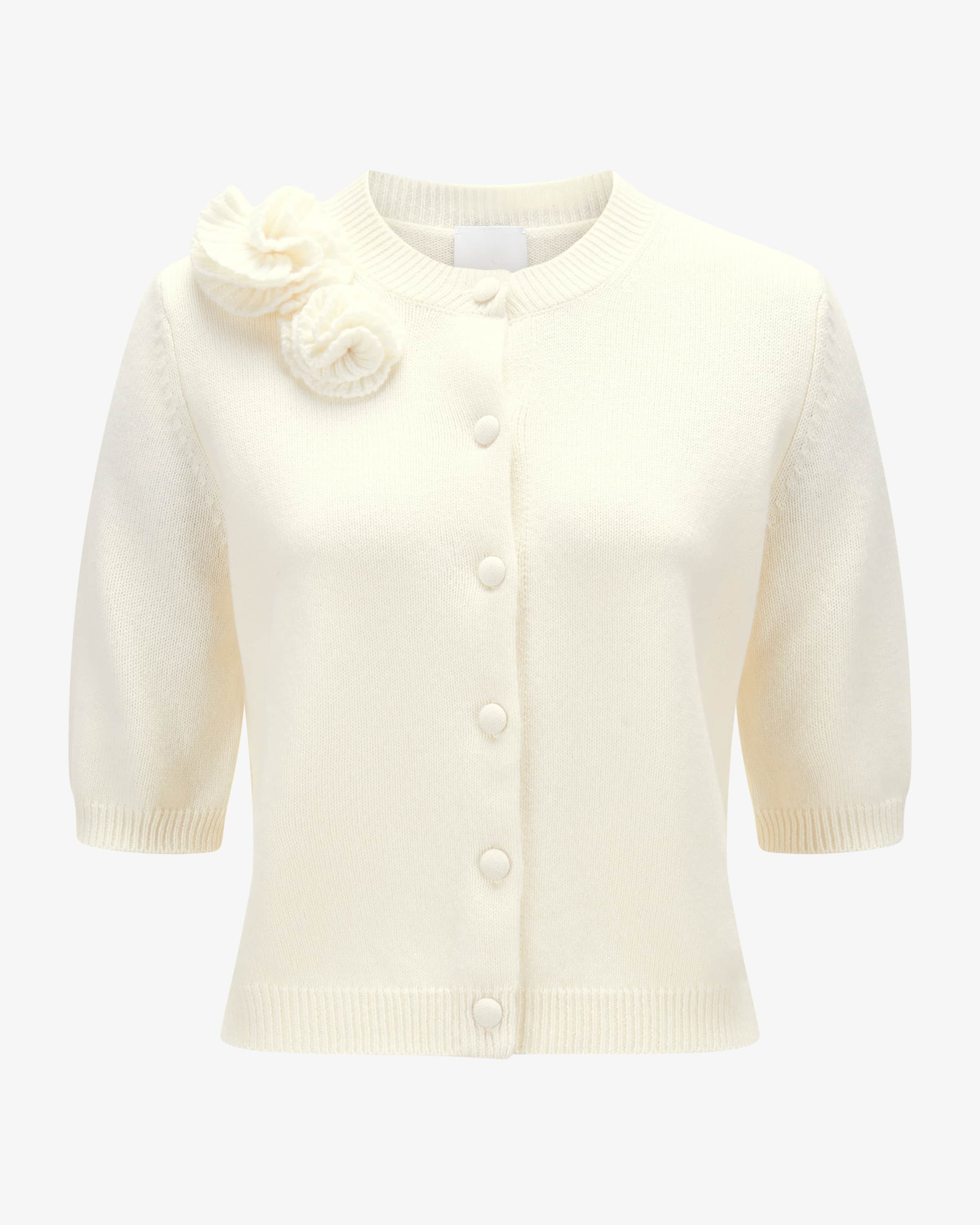 Cardigan for women from Allude in cream. The Munich label was founded in 1993 by Andrea and Christian Karg and is known for luxurious knitwear made from fine cashmere. fine cashmere. While the high-quality virgin wool and cashmere blend ensures comfortable moments, the wide cut with shortened sleeves adds a casual touch. casual touch. At the same time, the draped floral appliqués create special accents.