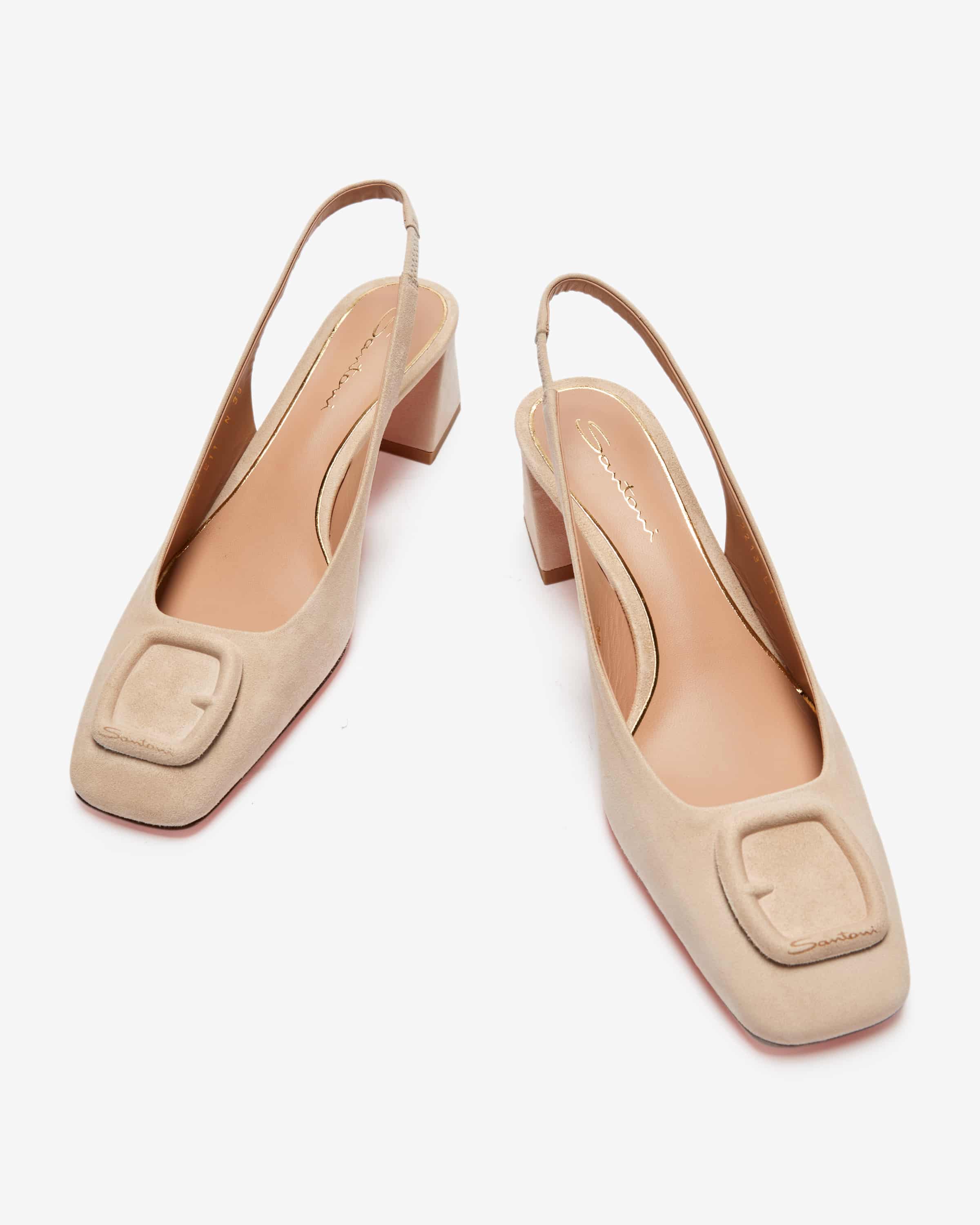 Carla slingback pumps for women from Santoni in beige. The Italian luxury brand stands for handmade shoes with flawless workmanship and an elegant finish. finish. This model made from high-quality suede features an elasticated slingback strap slingback strap and slanted block heel, which ensure a high level of comfort. wearing comfort. The square shoe shape, together with the decorative clasp appliqué, creates an clasp application creates an elegant and feminine look.