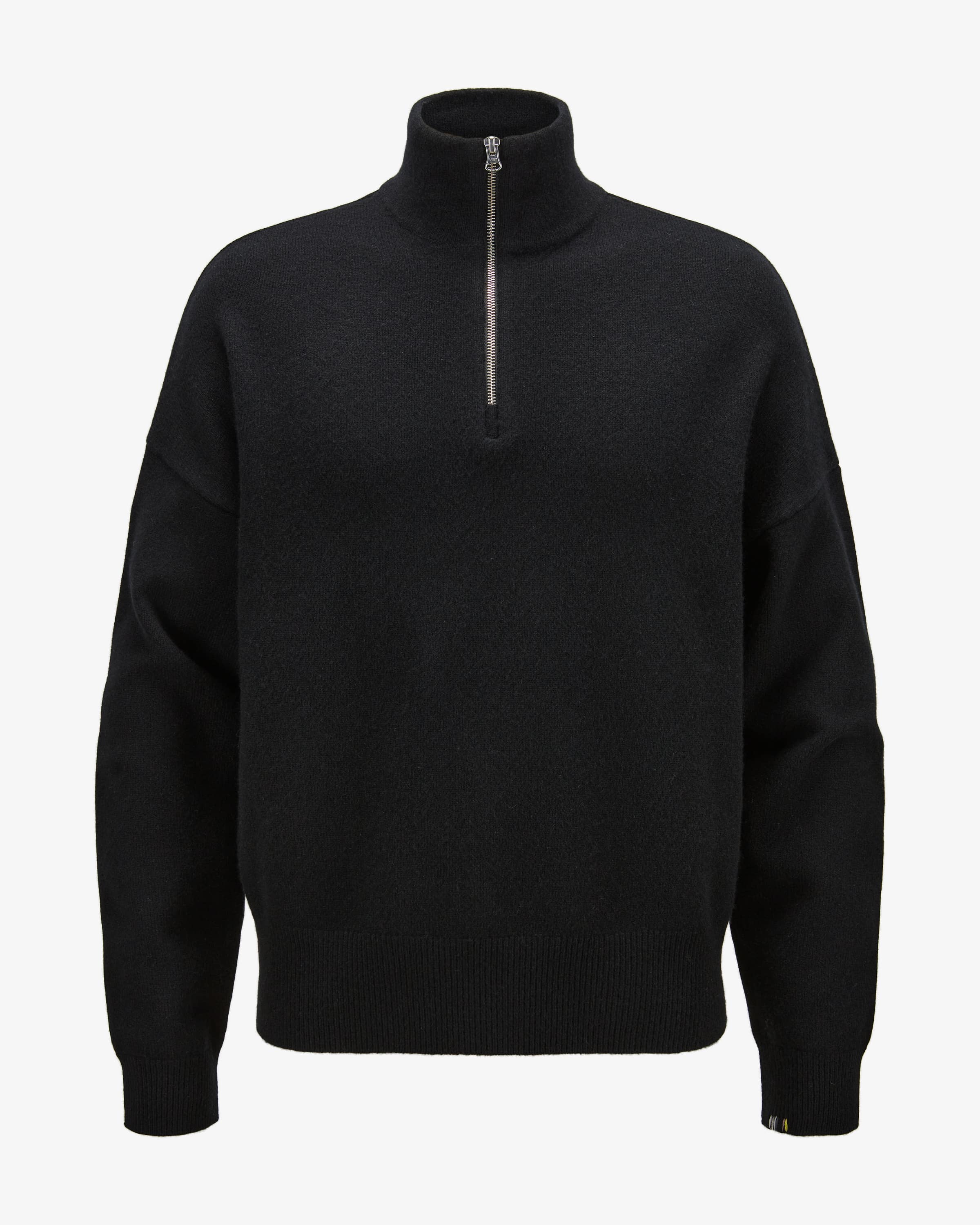 Cashmere troyer for men from Extreme Cashmere in black. The cashmere label is known for its gender-neutral fashion with one size fits all and is suitable for every body. This model is also characterized by its high-quality cashmere quality makes it particularly comfortable to wear. At the same time, the discreet logo embroidery on the sleeve ends rounds off the timeless overall look typical of the label.