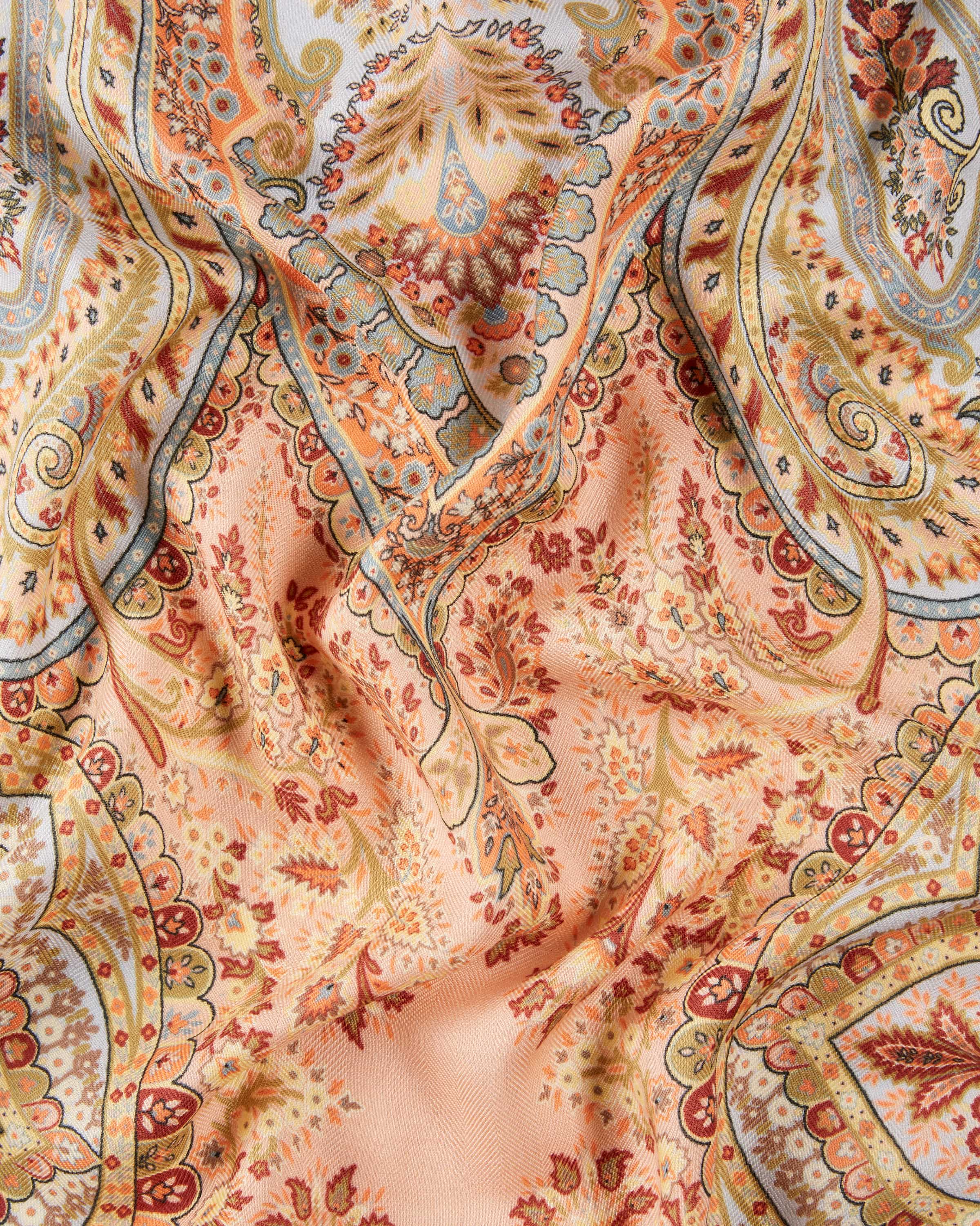 Cashmere silk scarf for women from Etro in light blue, apricot and light yellow. While the label's signature paisley pattern creates a fashionable eye-catcher, the high-quality cashmere-silk fabrication with a light feel nestles comfortably against your pleasantly against your skin.