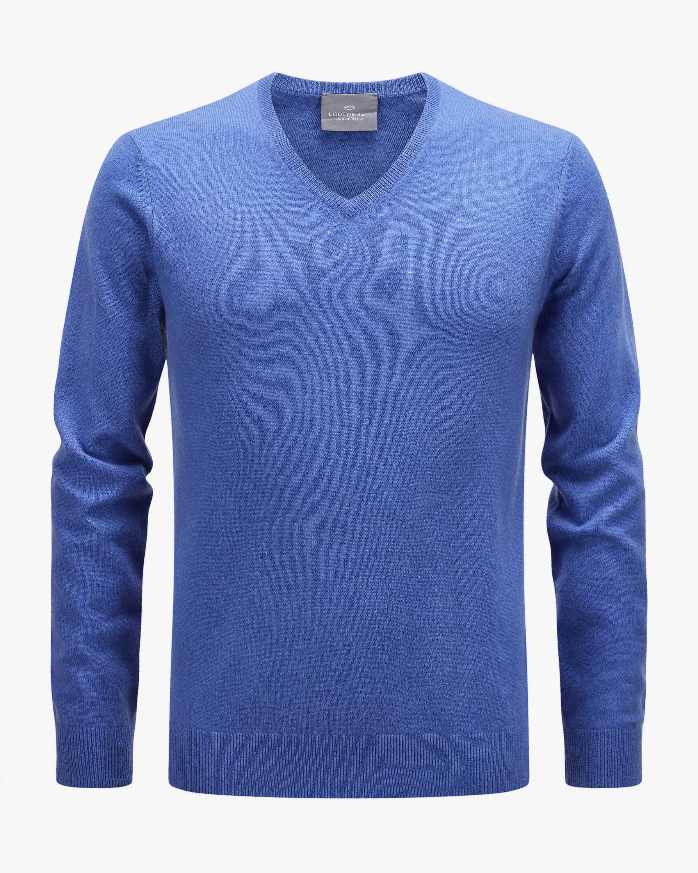 Cashmere sweater for men from LODENFREY in blue. Thanks to the use of high-quality cashmere fabric, this model impresses with its soft feel, while the simple the simple design creates a timeless companion for versatile everyday looks. creates.