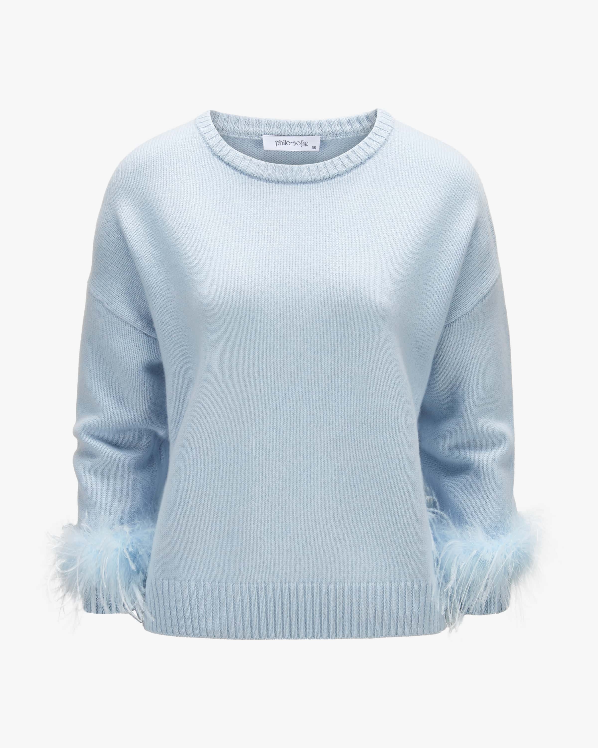 Cashmere sweater for women from Philo-Sofie Cashmere in light blue. The German label stands for luxurious, modern cashmere pieces - soft, durable, stylish. This model also impresses with its modern silhouette and extravagant feather feather appliqués on the sleeves. The cosy cashmere quality guarantees pleasant comfort and harmoniously rounds off the style.