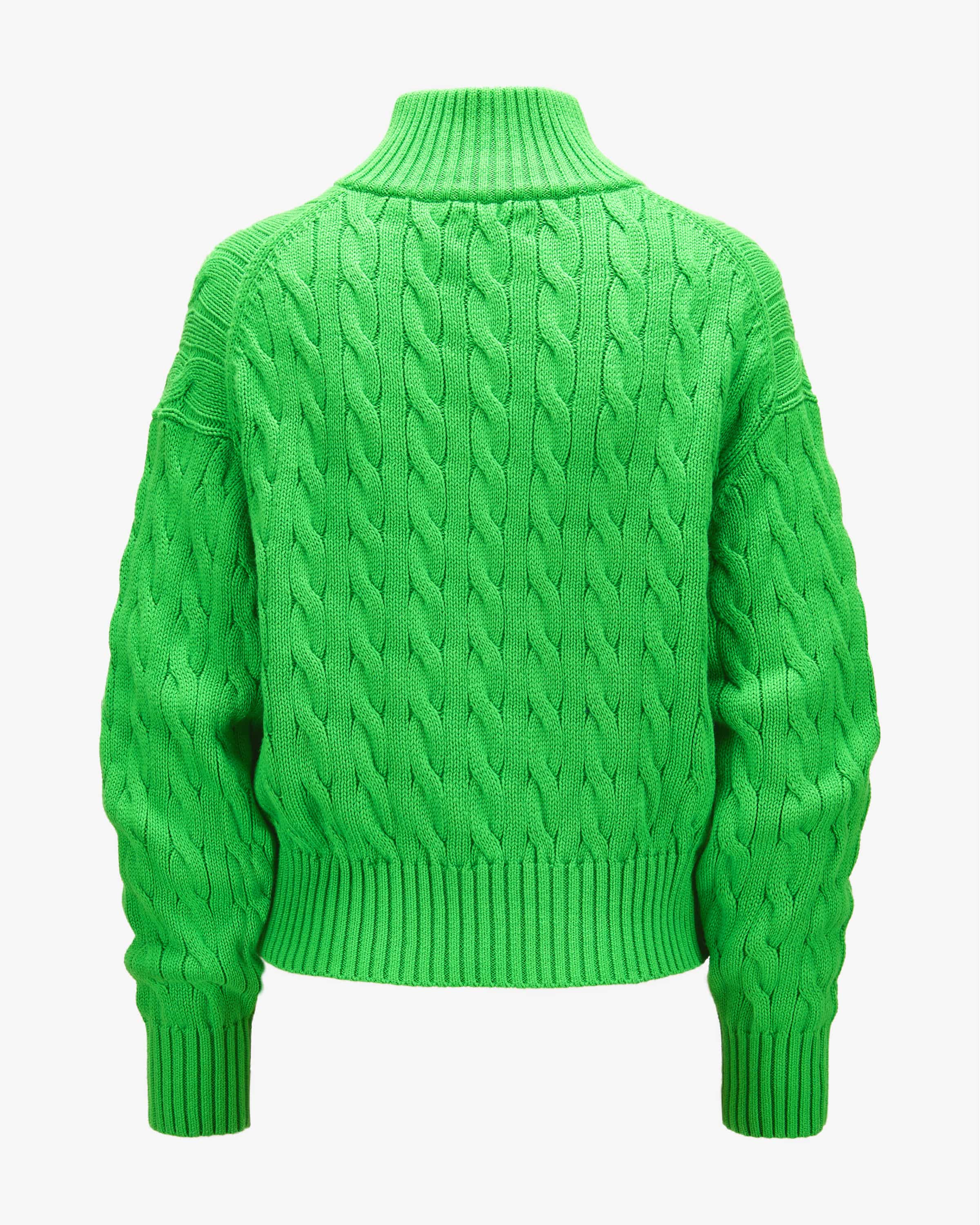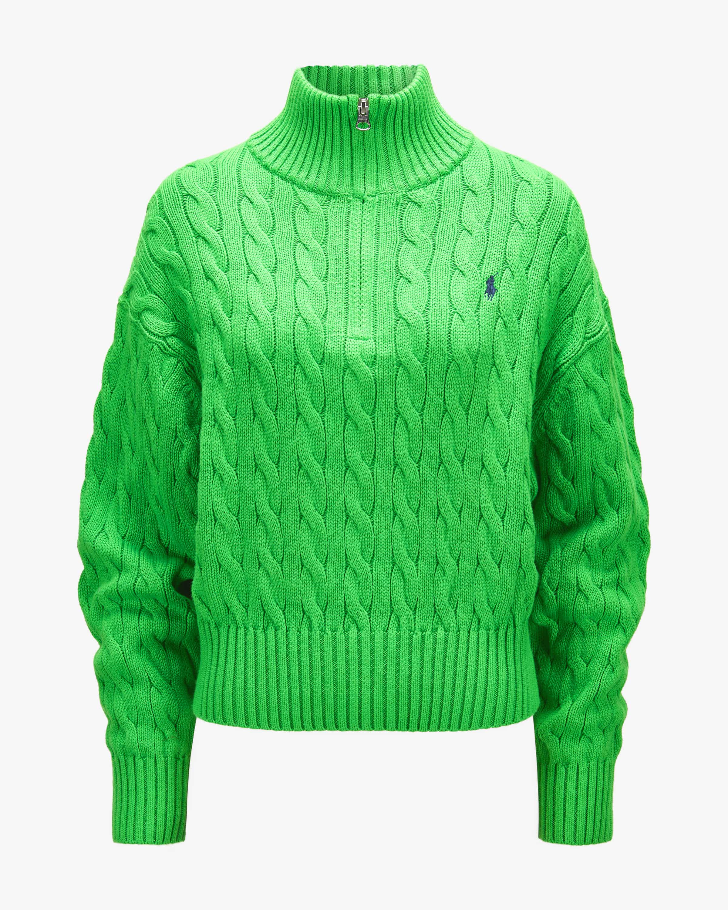 Troyer for women from Polo Ralph Lauren in neon green. While the contrasting polo rider embroidery gives the model a characteristic touch the casual cut with tapered cuffs and the sophisticated cable knit pattern create a and the sophisticated cable knit pattern create a timeless knitwear favorite for modern looks.