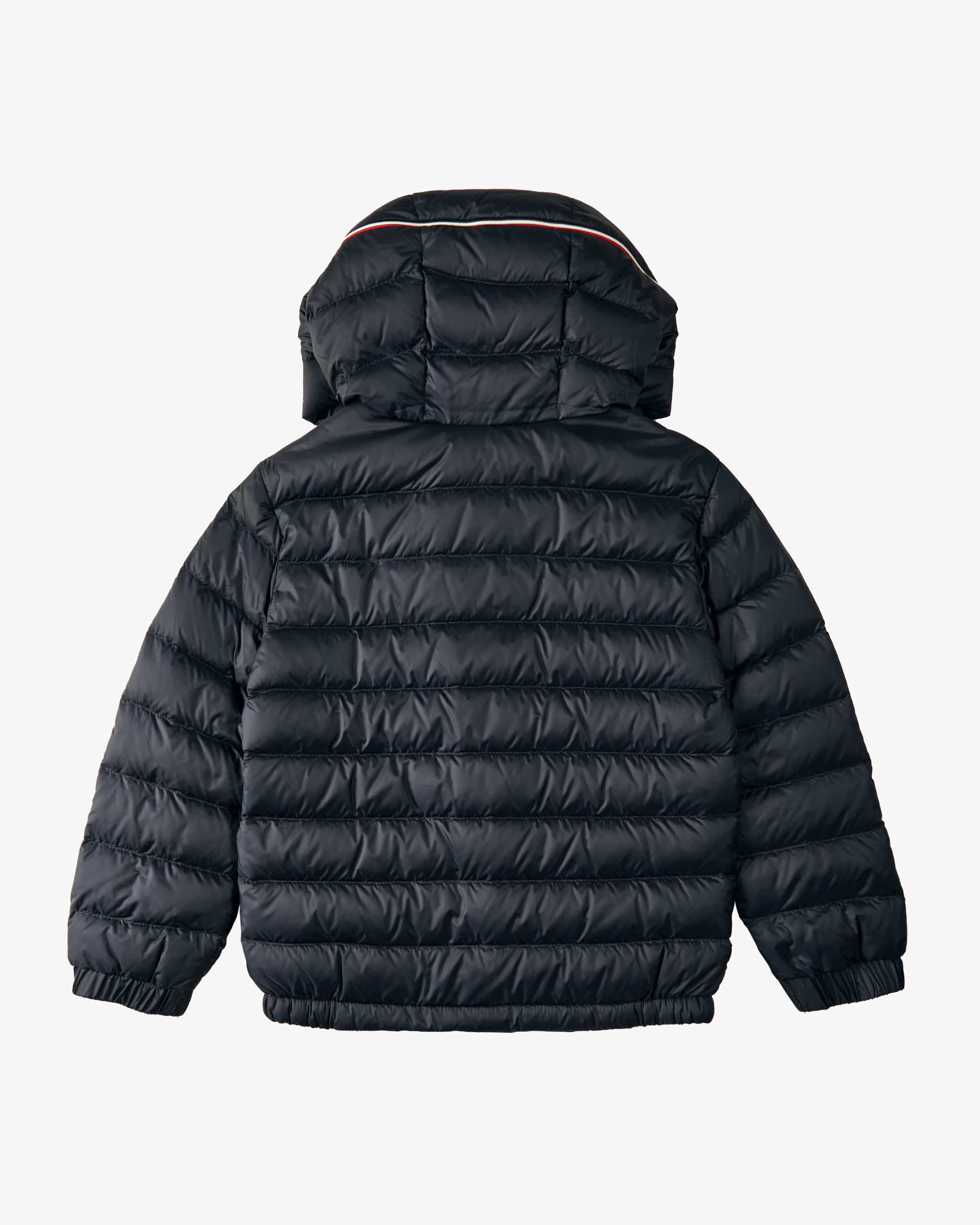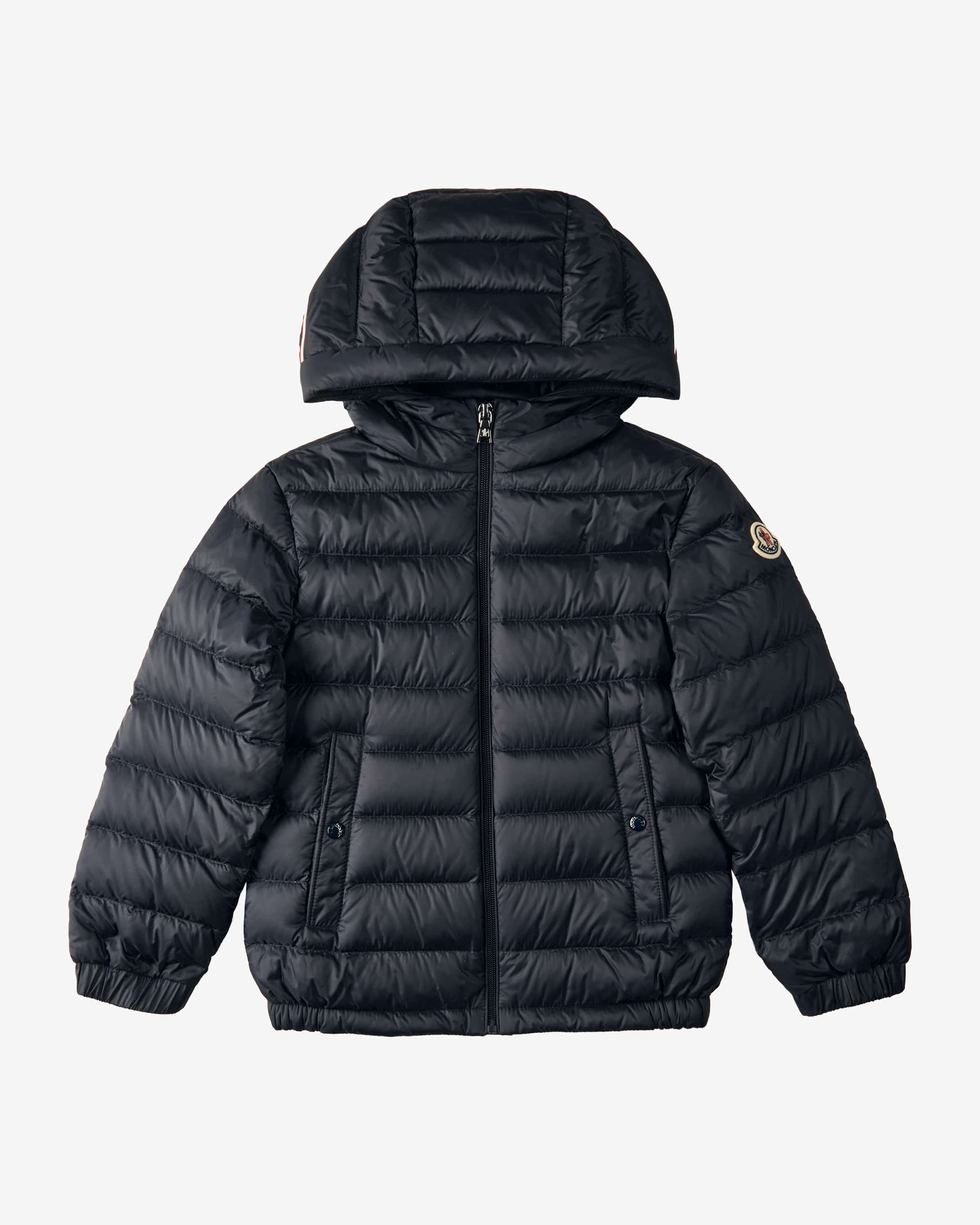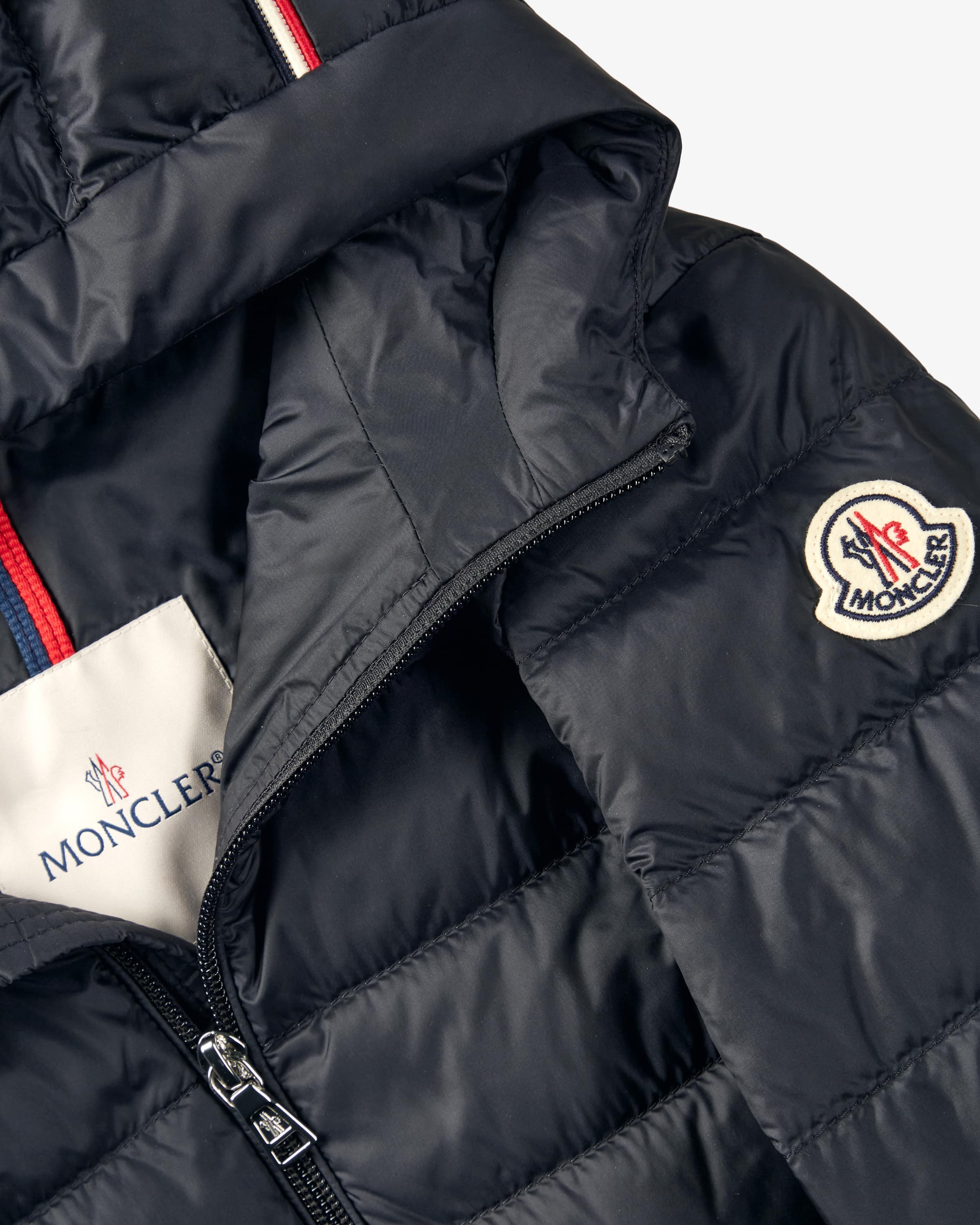 Dilar down jacket for boys from Moncler Enfant in navy. When you think of warm, high-quality down jackets, the traditional Italian label Moncler traditional label Moncler comes to mind. The classic cut model impresses with down and feather filling, which ensures warm moments of wear, while the elasticated hems and the elasticated hems and pockets provide sporty accents. The iridescent quilted design and the label's signature emblem harmoniously round off the overall look.