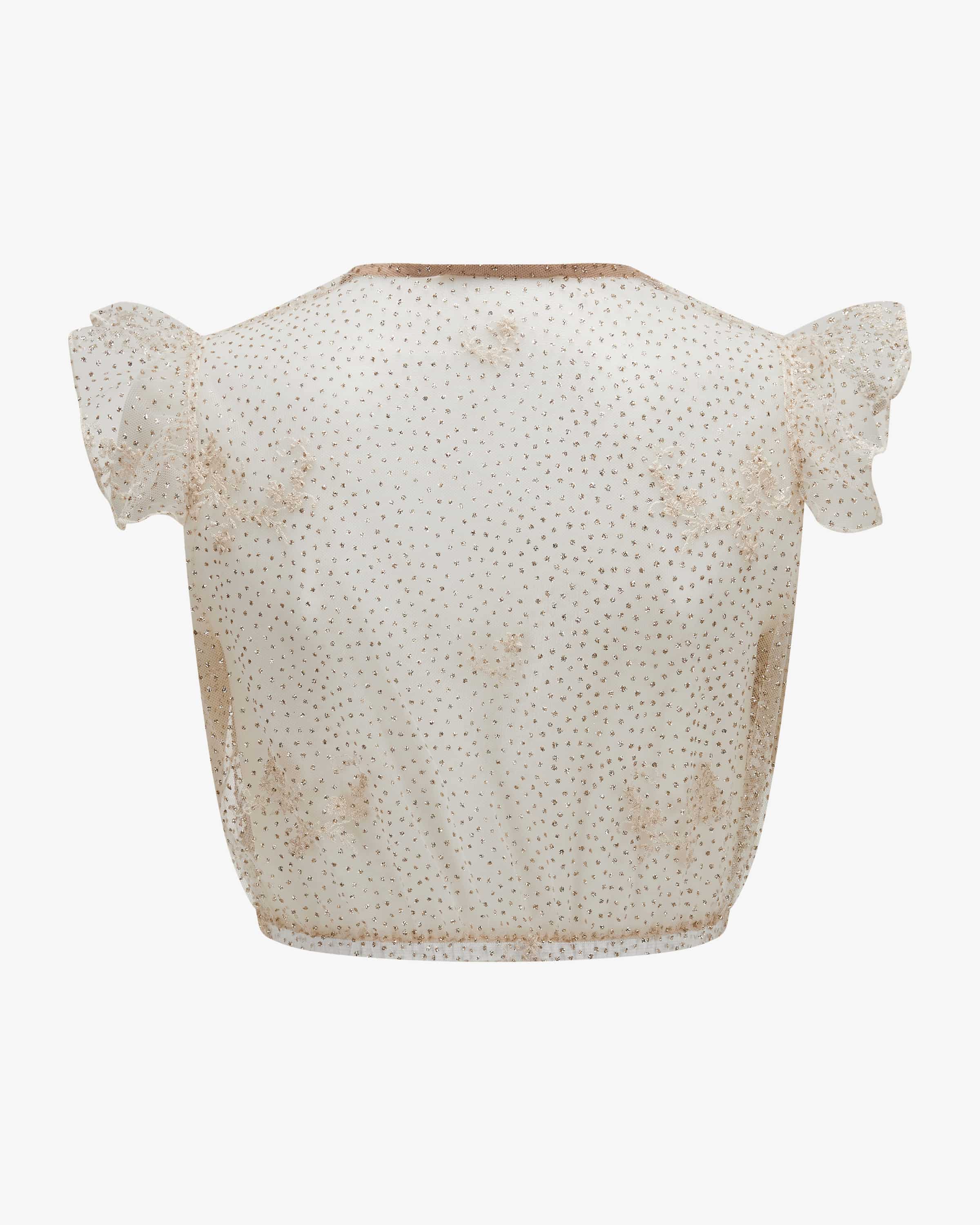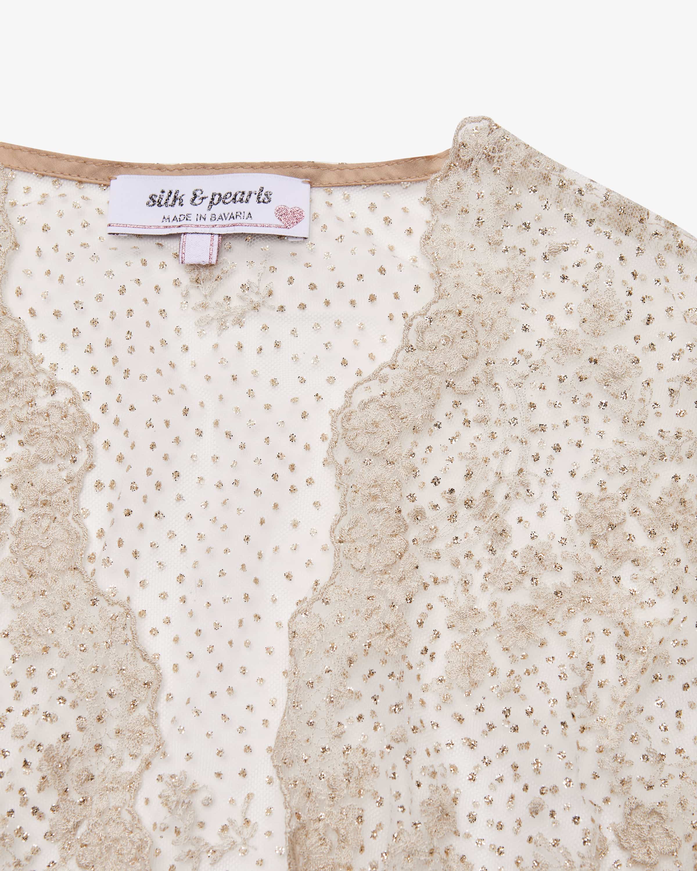 Dirndl blouse for women from Silk & Pearls in gold. The model impresses with semi with semi-transparent, dotted tulle, romantically finished with floral embroidery and feminine romantic finish with floral embroidery and feminine cap sleeves.