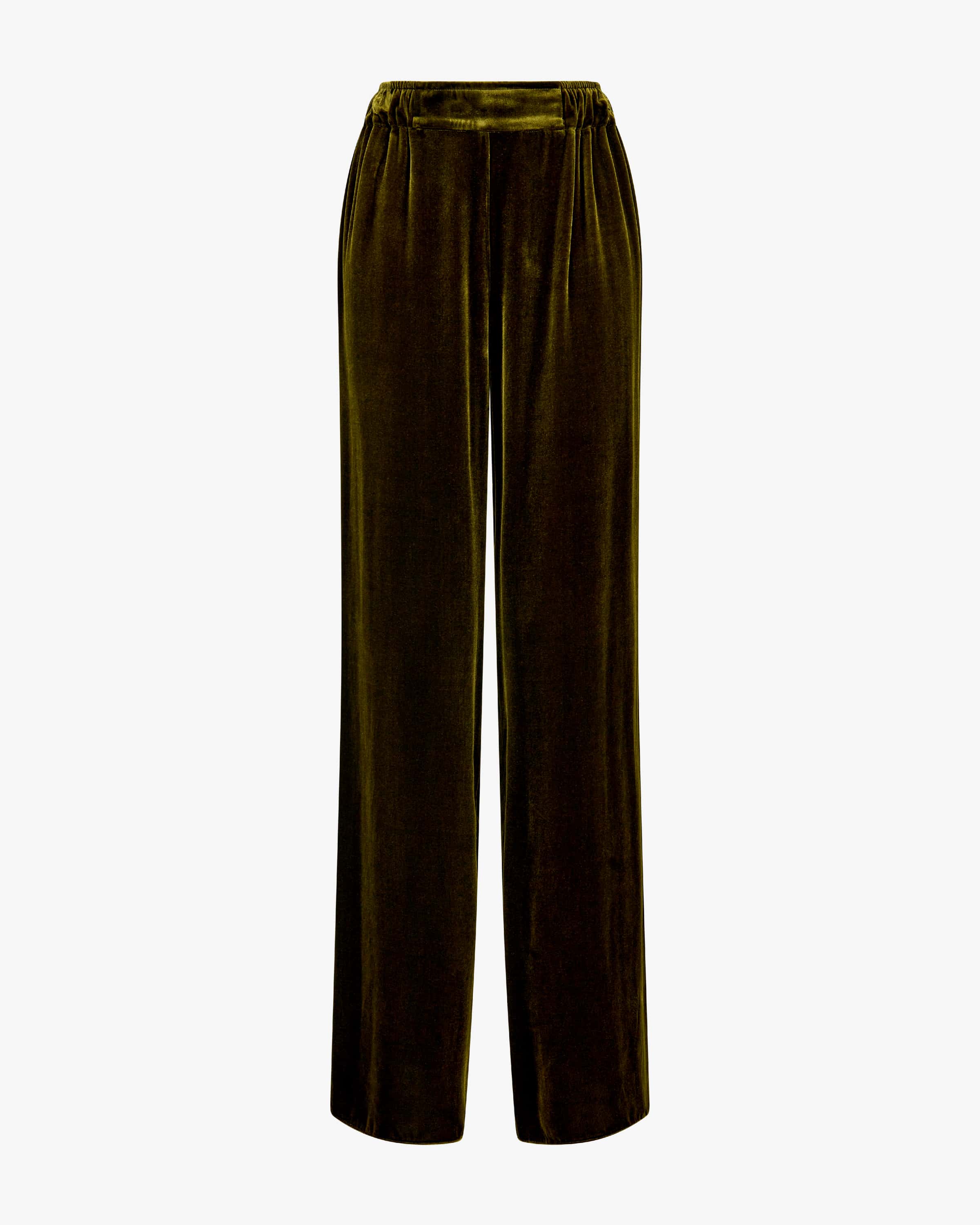Dusty velvet trousers for women from Natan in olive. With this model, the Belgian label has label has created a special piece in a comfortable velvet fabric that is a feminine highlight thanks to its wide cut with an elastic waistband to create a feminine highlight that which also scores highly in terms of comfort.