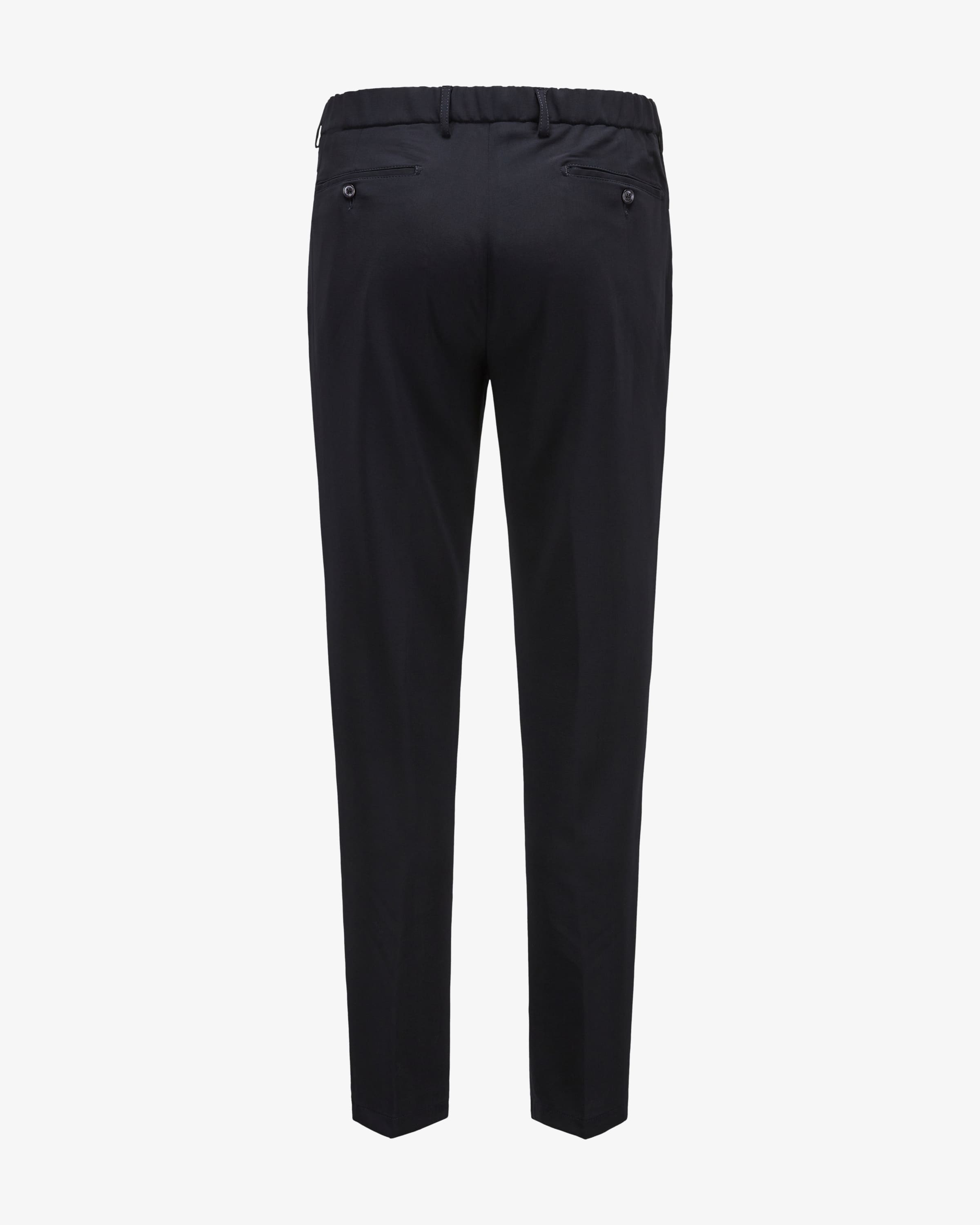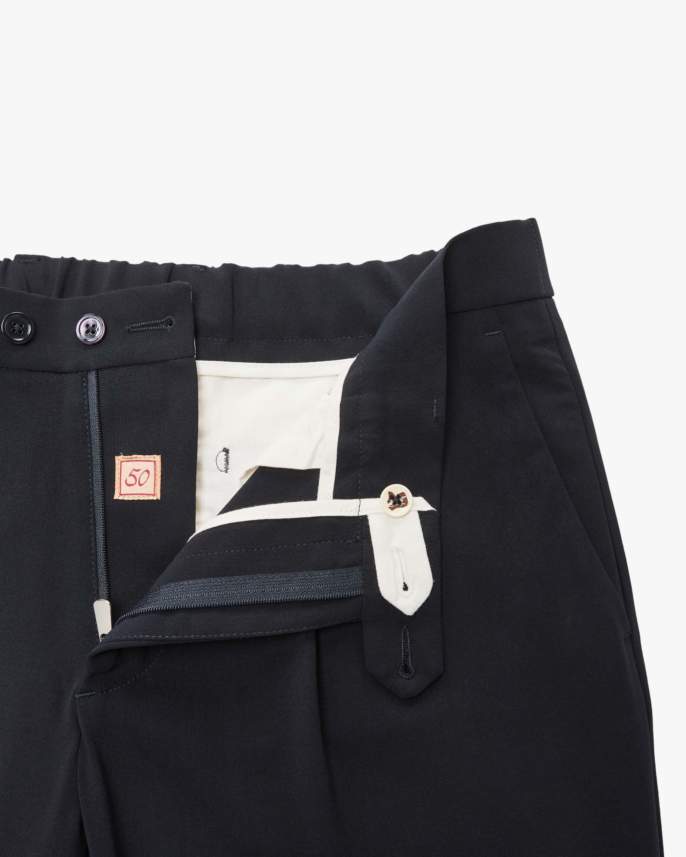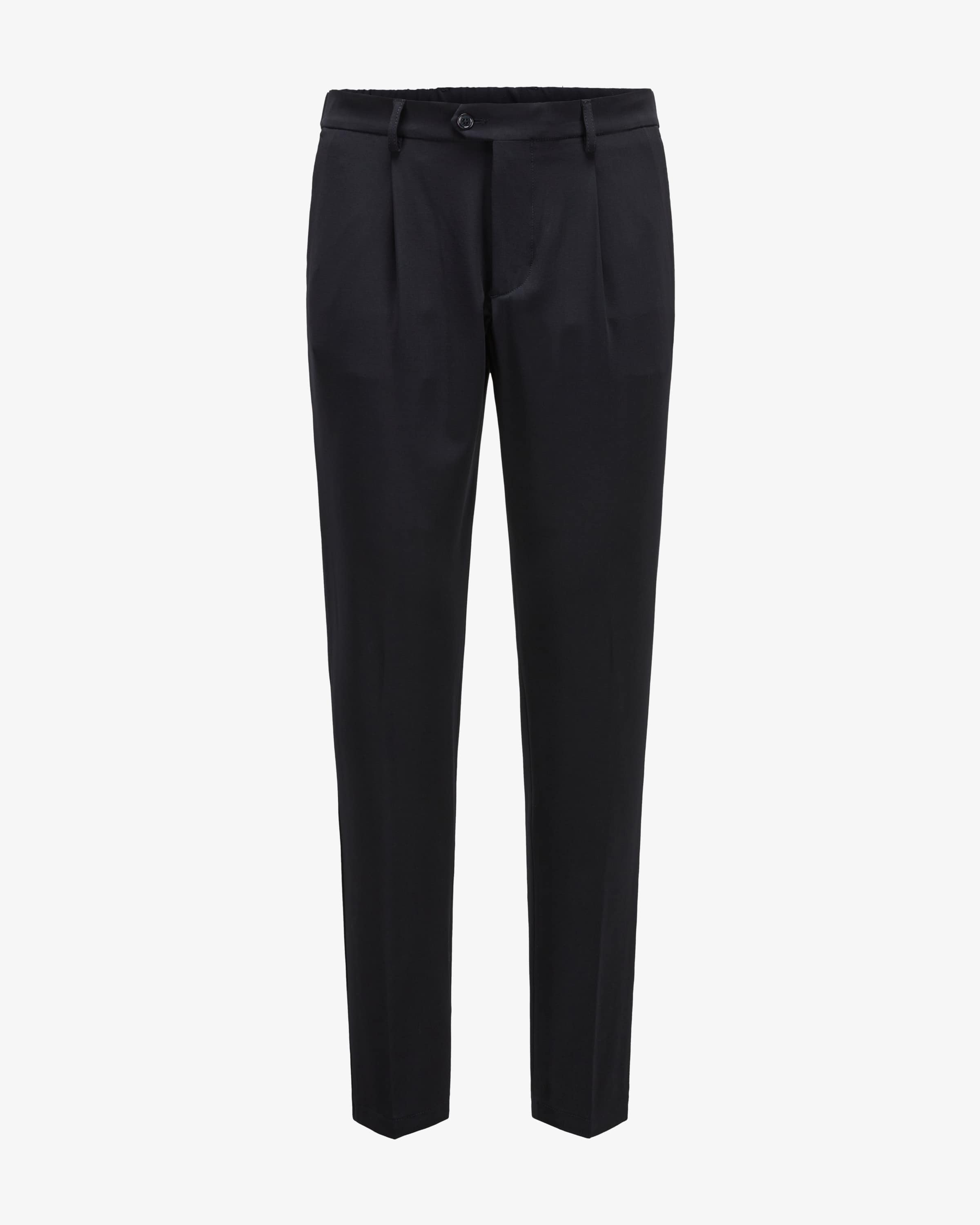 Far trousers for men from Marco Pescarolo in navy. This model with tapered legs are extremely comfortable to wear thanks to the lightweight and stretchy virgin wool crepe, while the stylish pleated design is accentuated by the detachable pendant with stones and mask. with stones and a mask is typical of the label.