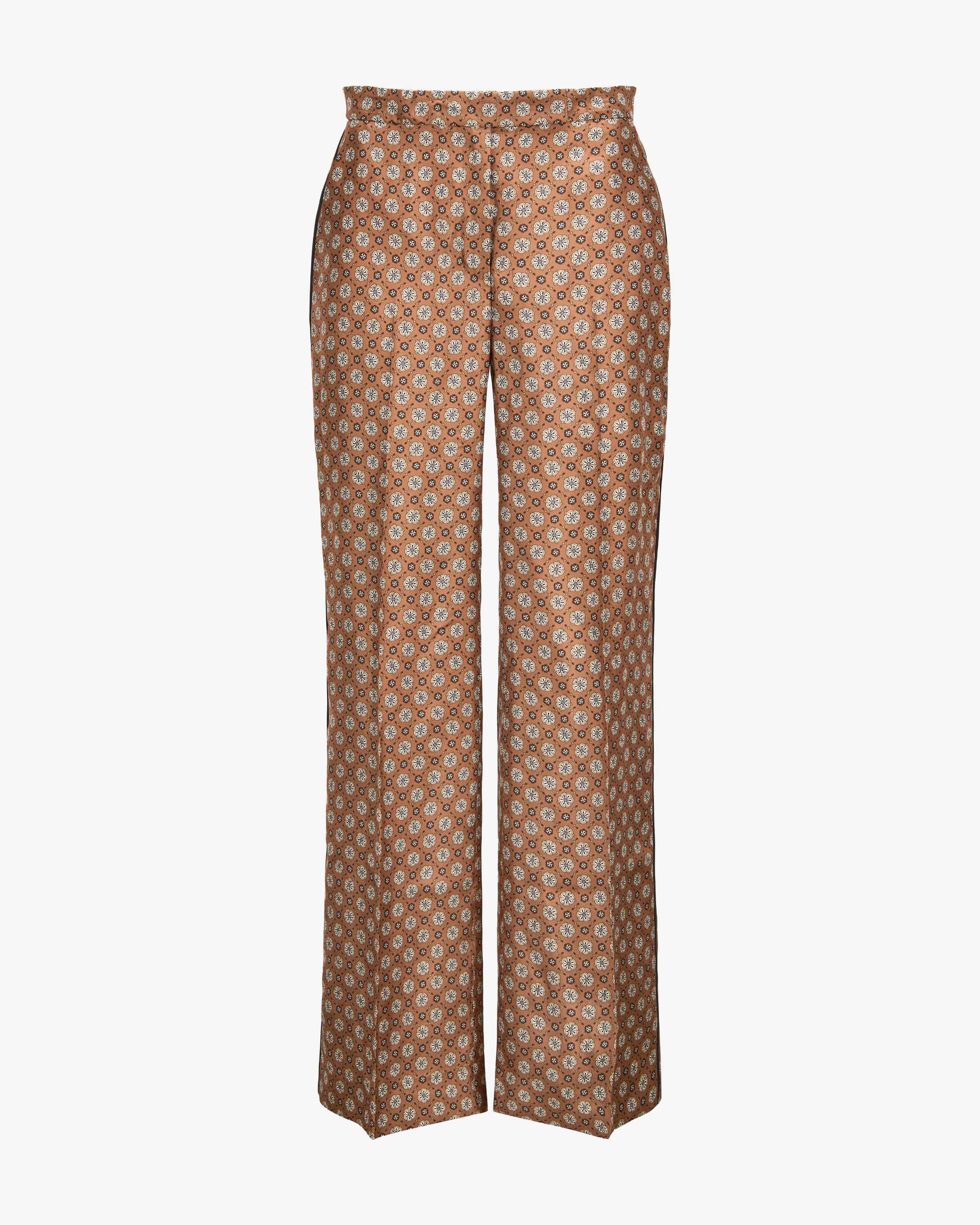 Graphic Dreams silk trousers from Dorothee Schumacher in cognac, white and dark brown.