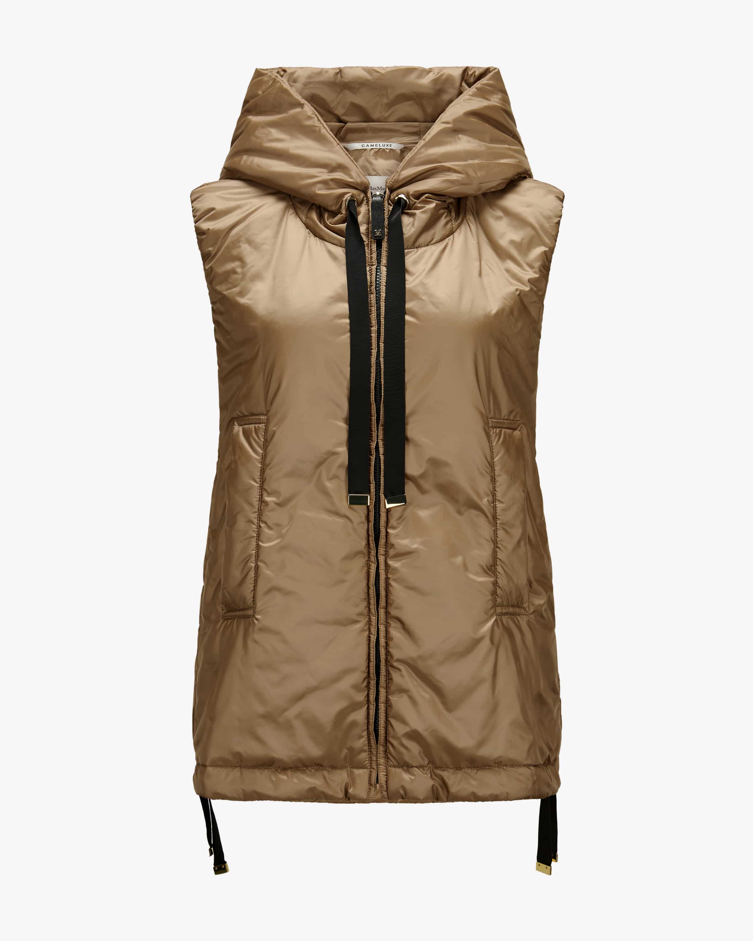Greengo vest for women from Max Mara The Cube in light brown. The model presents itself in a simple design, while the discreetly flared fit fit harmoniously sets the scene for the overall look. The vest is also characterized the insulating CamelLuxe padding, which is produced using a special upcycling process. upcycling process.