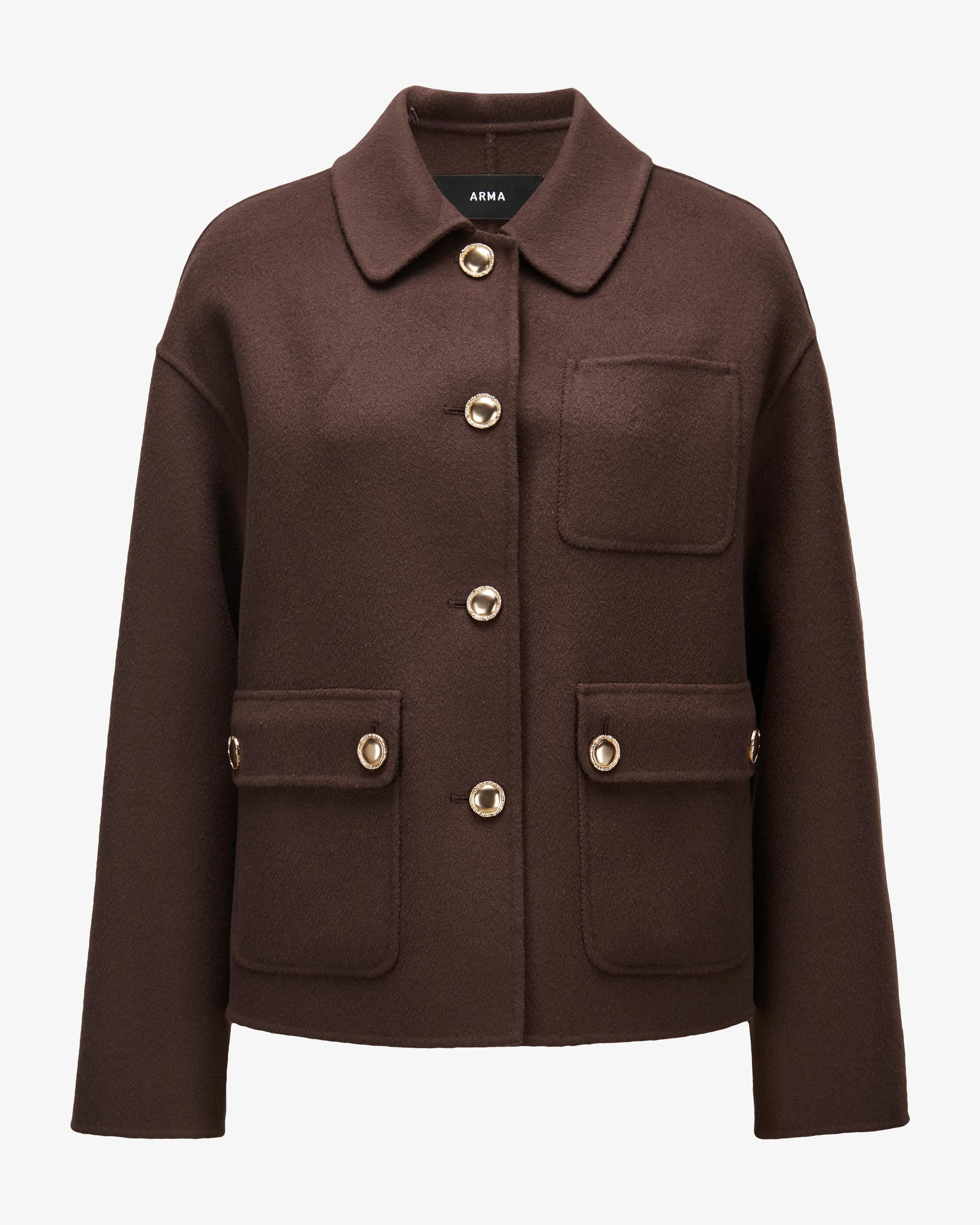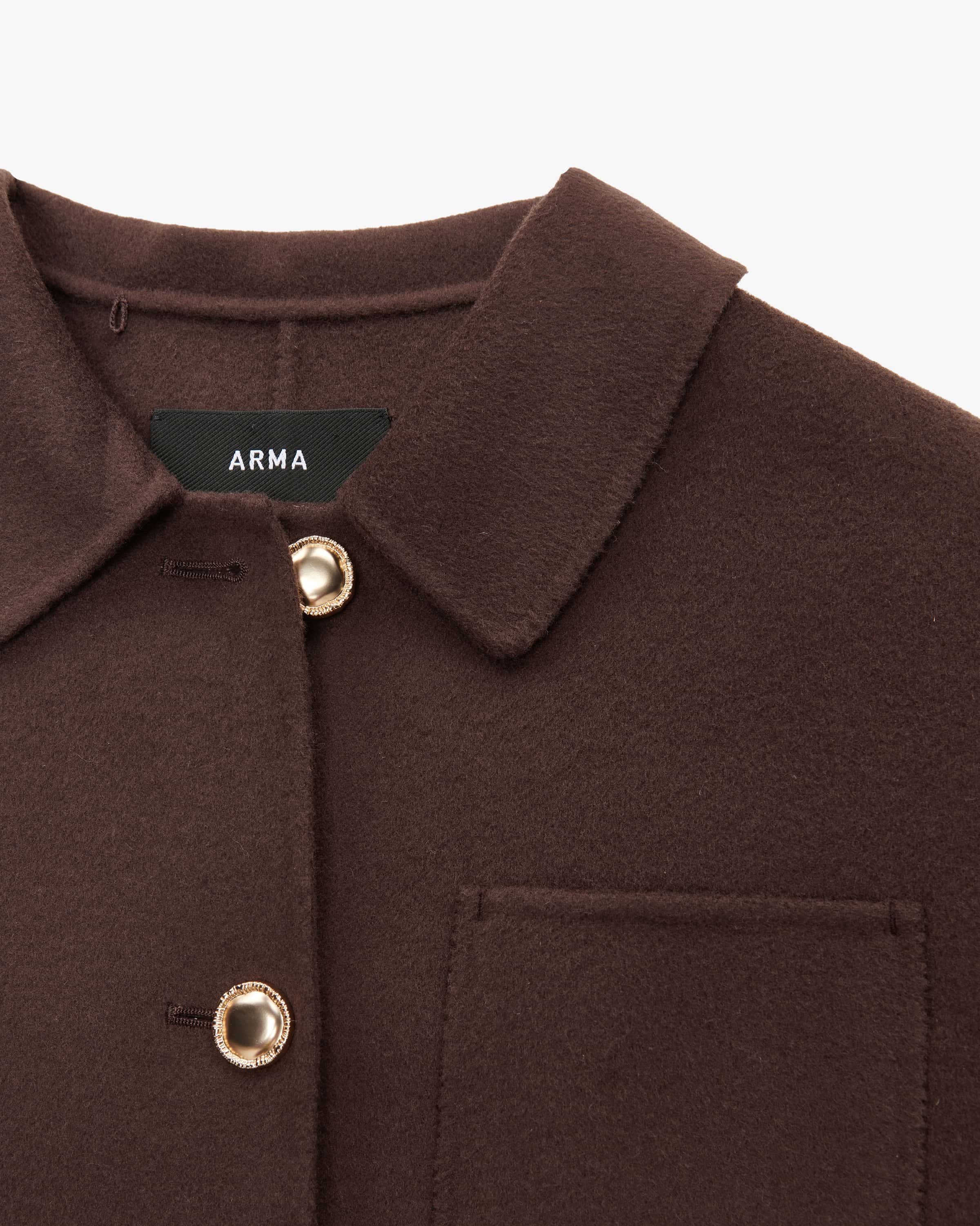 Hollywood wool jacket for women from Arma in mahogany. This slightly cropped model features high-quality wool fabric that is both tactile and visually appealing. and visually convincing. The gold-colored buttons stylishly round off the look.
