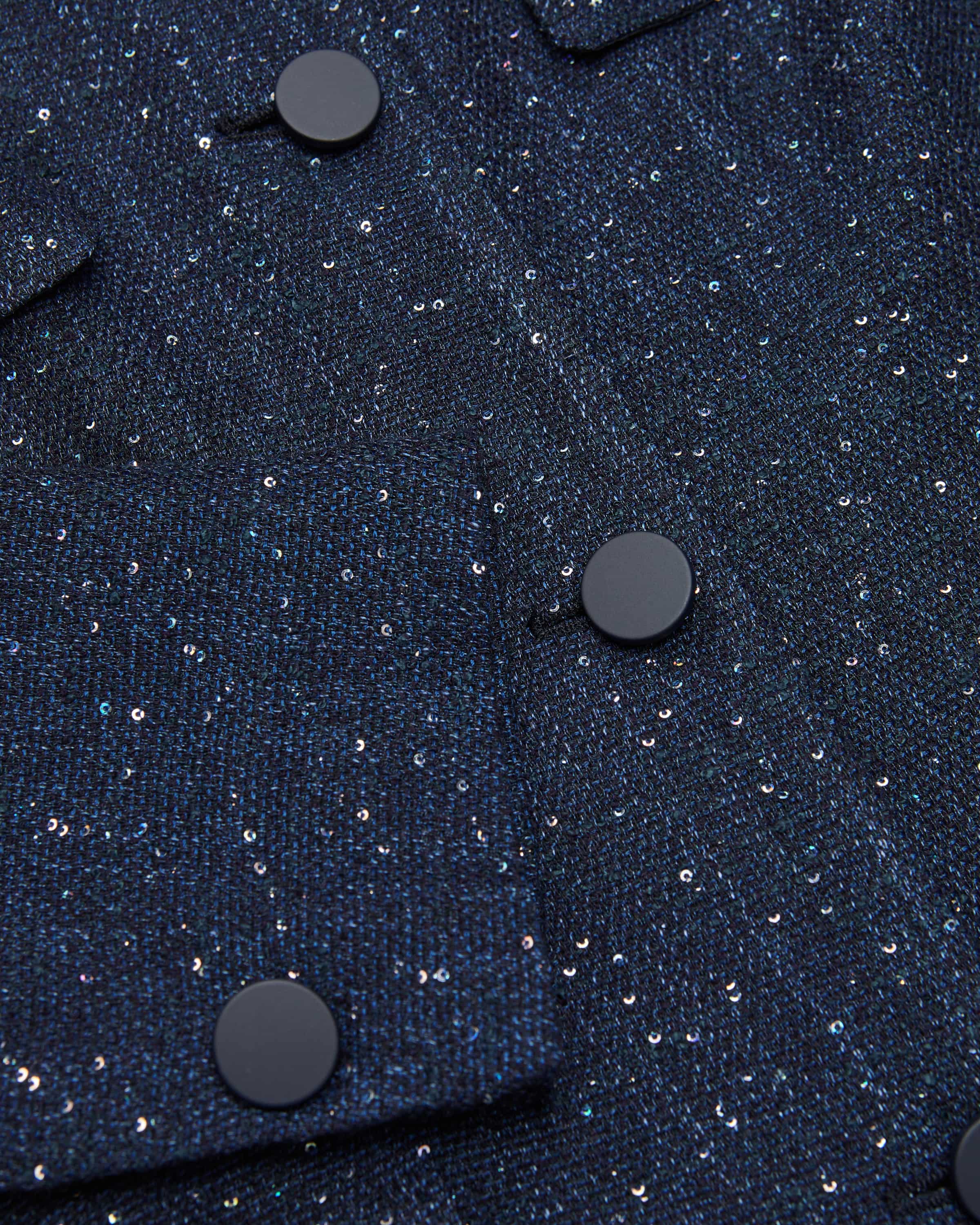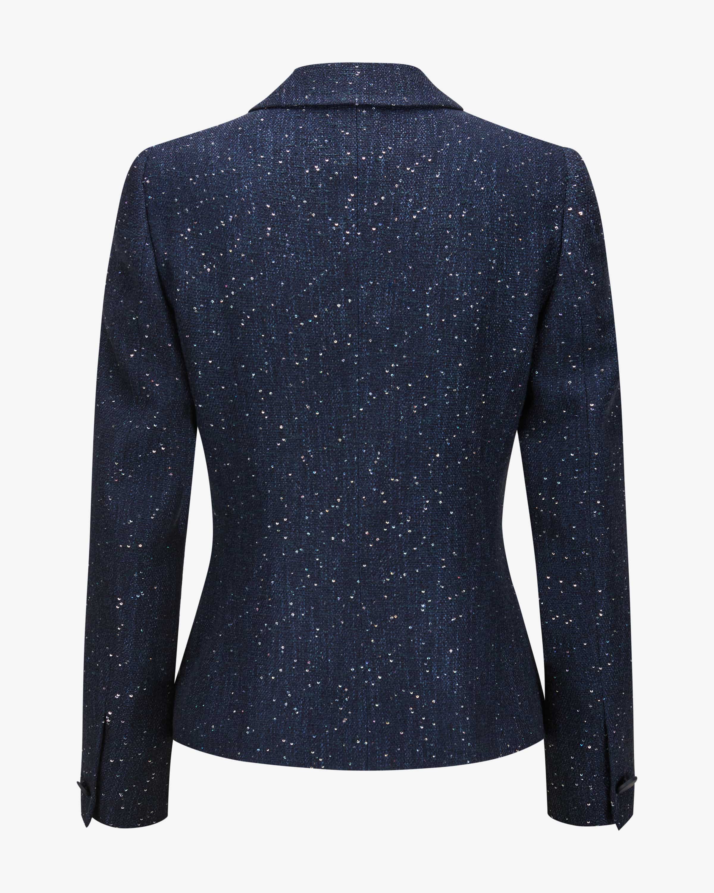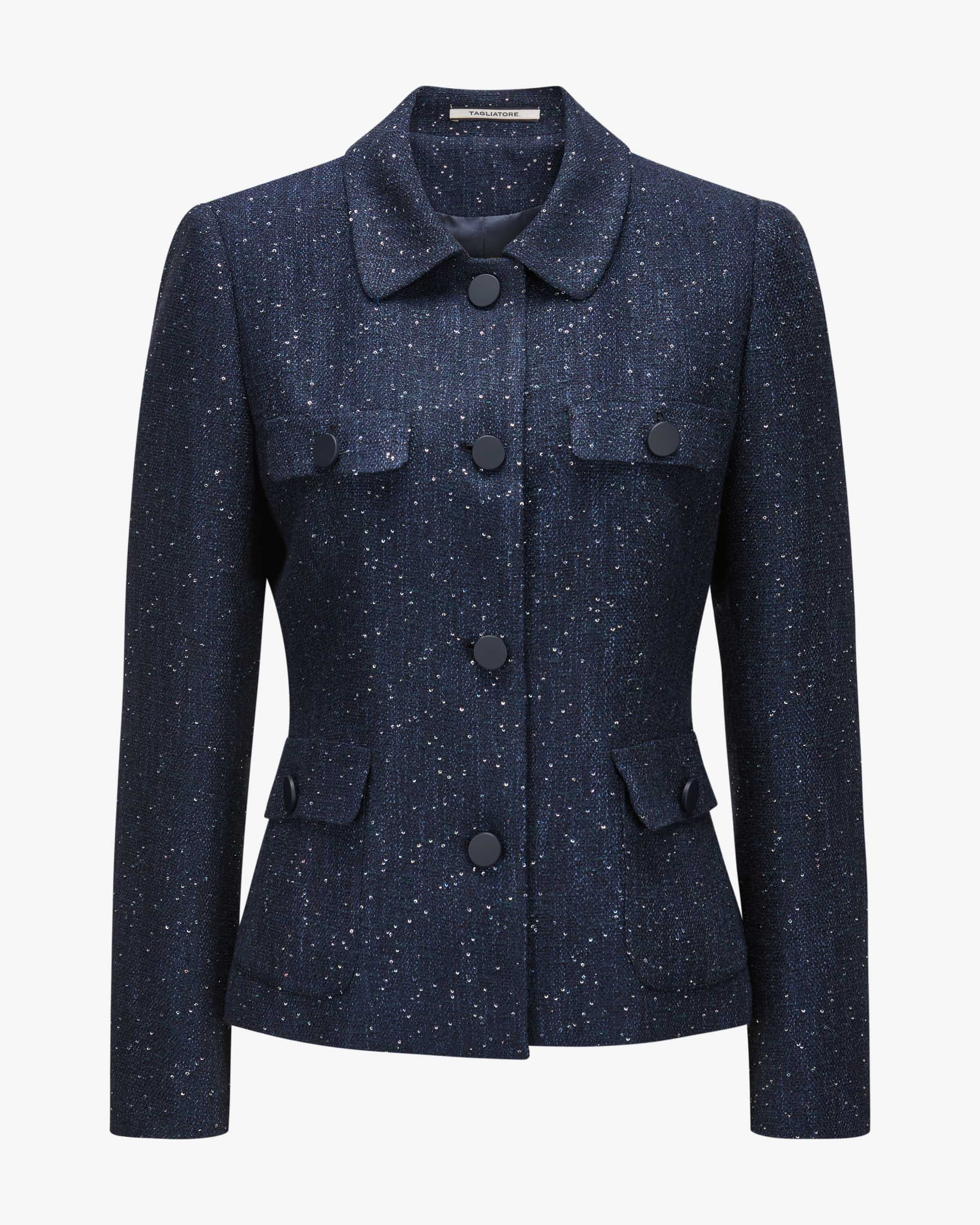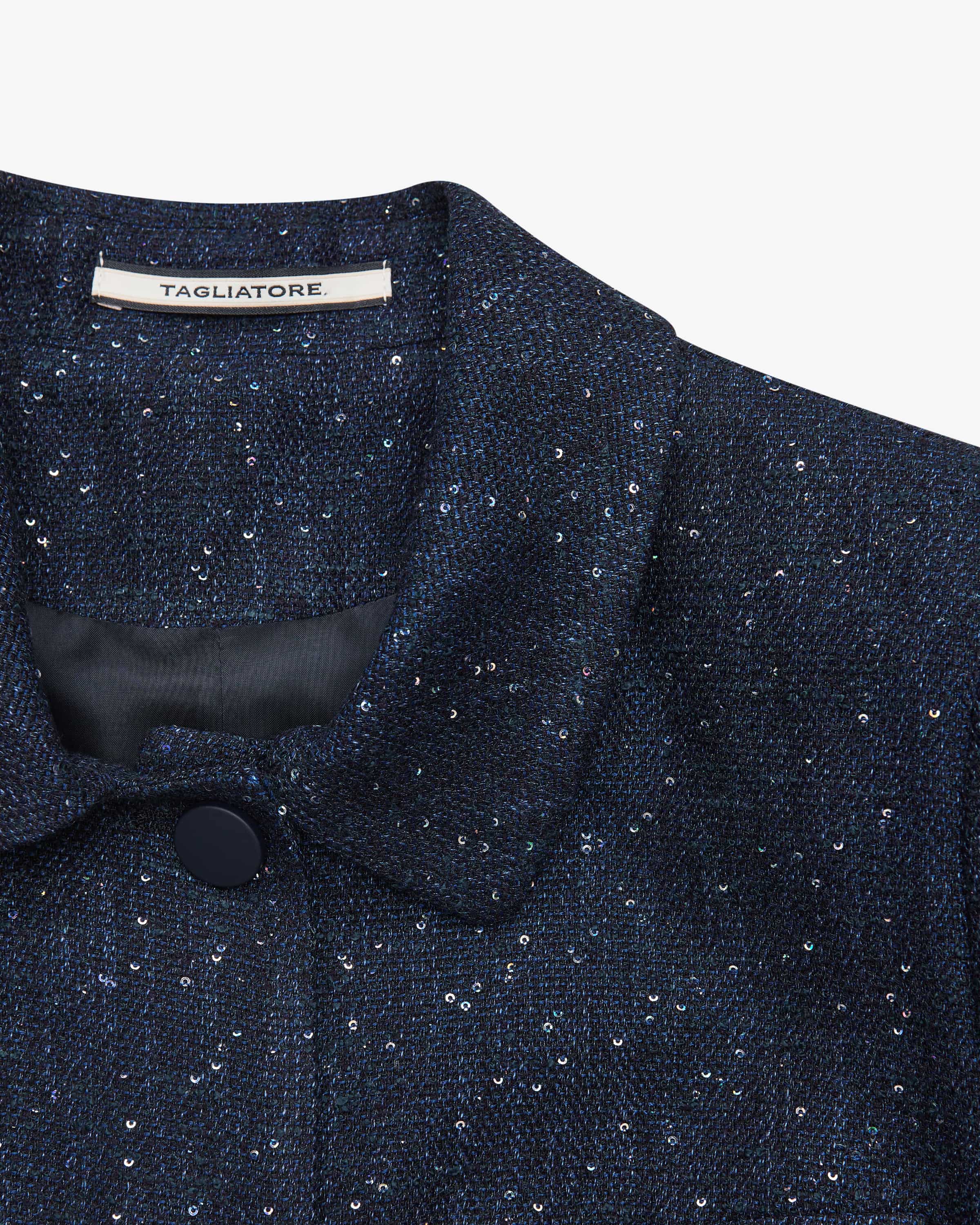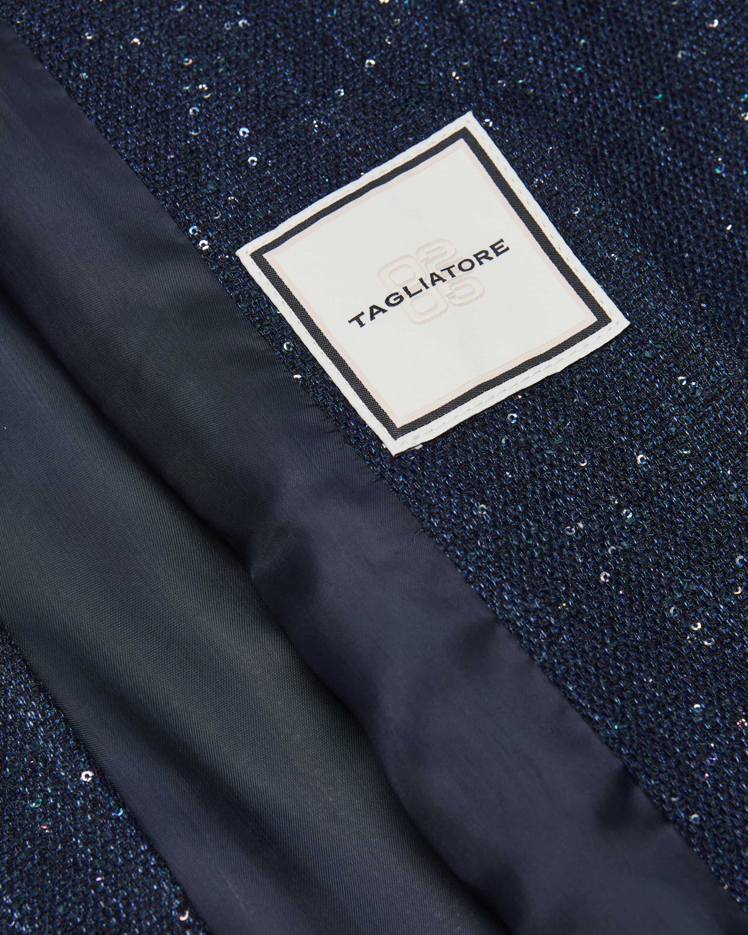 India bouclé blazer for women by Tagliatore in navy. The Italian brand stands for excellent men's and women's blazers - the finest tailoring from Apulia with a modern touch. This model also features a tailored silhouette silhouette and classic details, while the iridescent sequins create a feminine create a feminine eye-catching look.