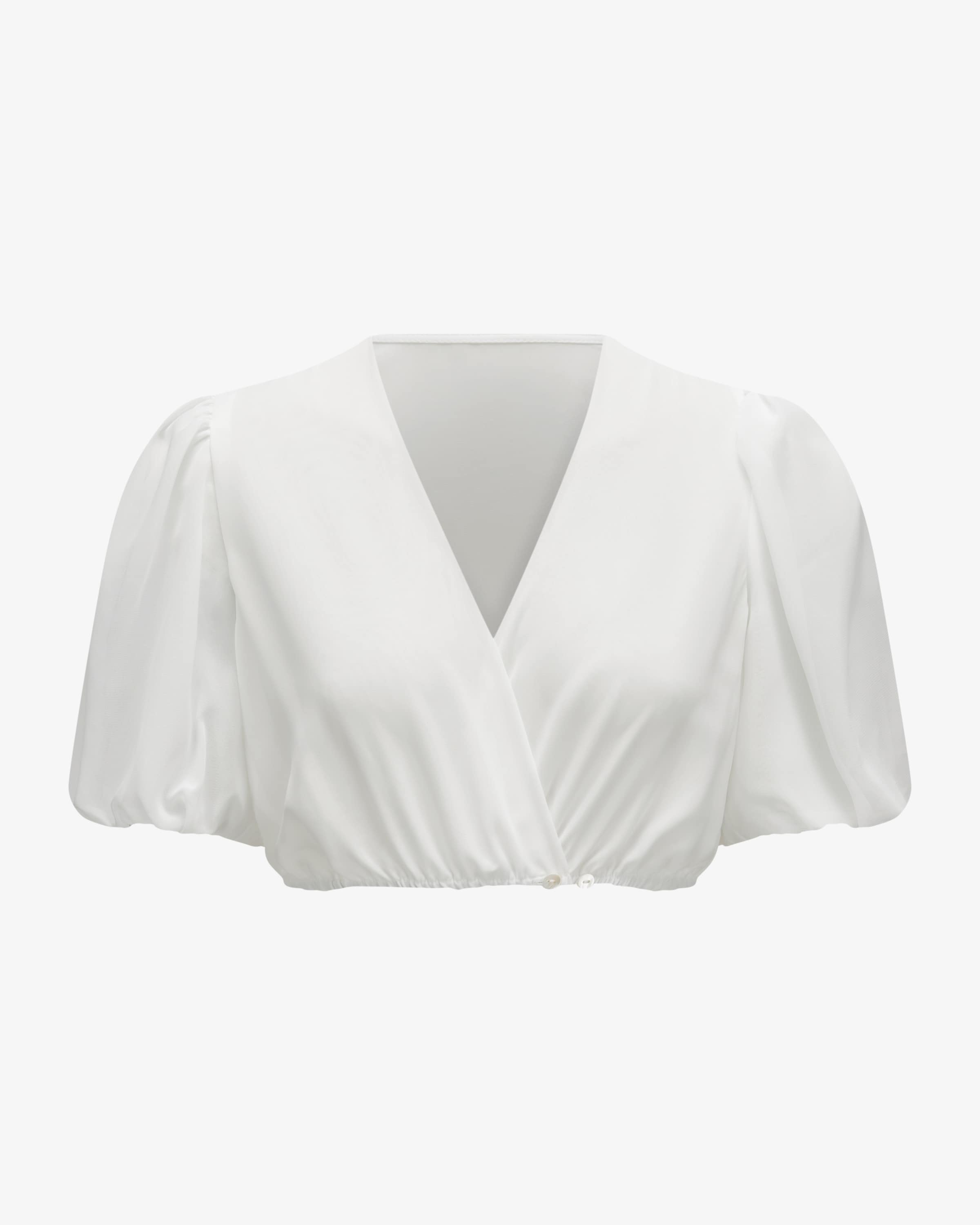 Lejla dirndl blouse semi-transparent for women by LODENFREY in ecru. Thanks to the semi-transparent finish with short puffed sleeves, this model with a the model in a wrap design with a feminine, romantic character.