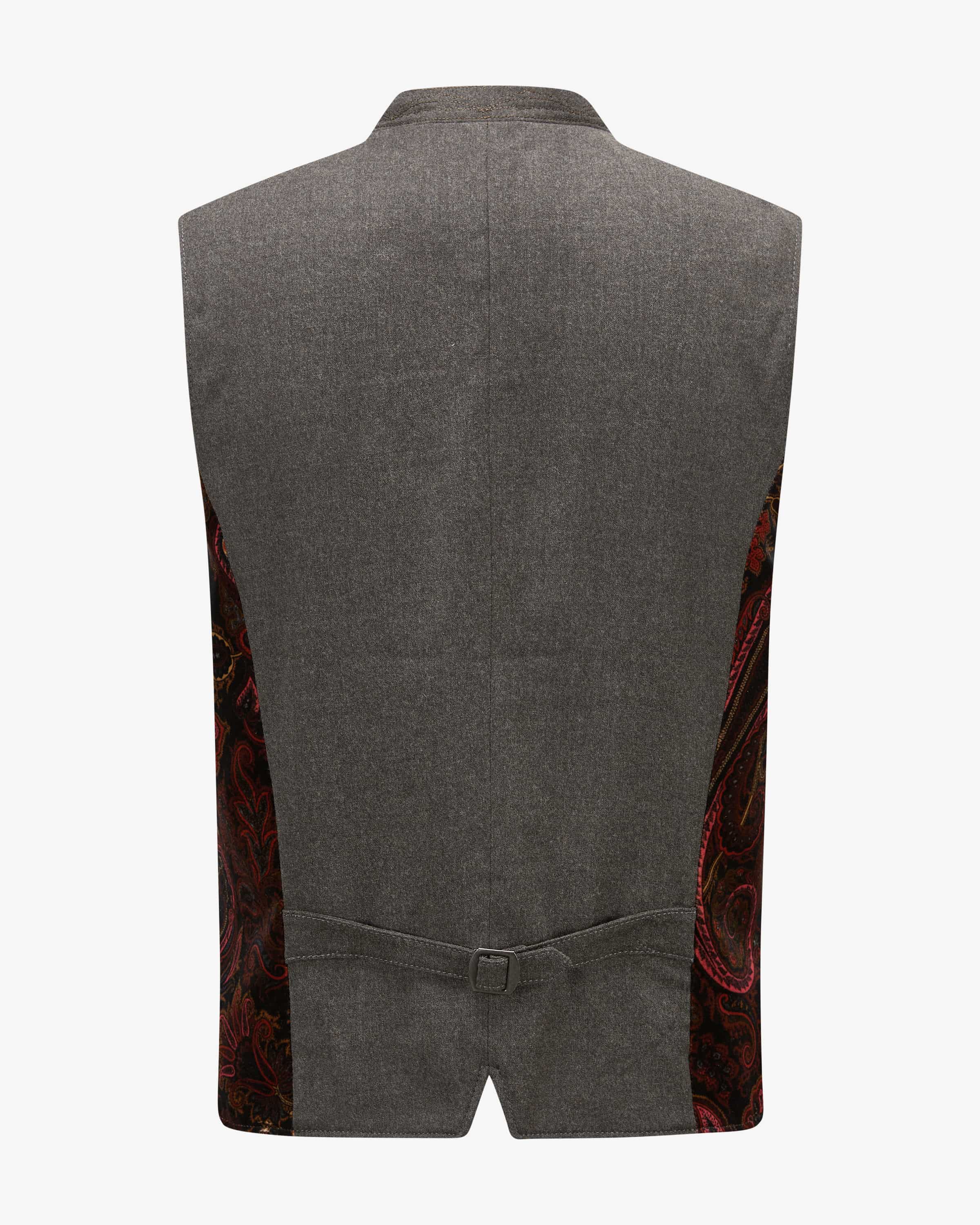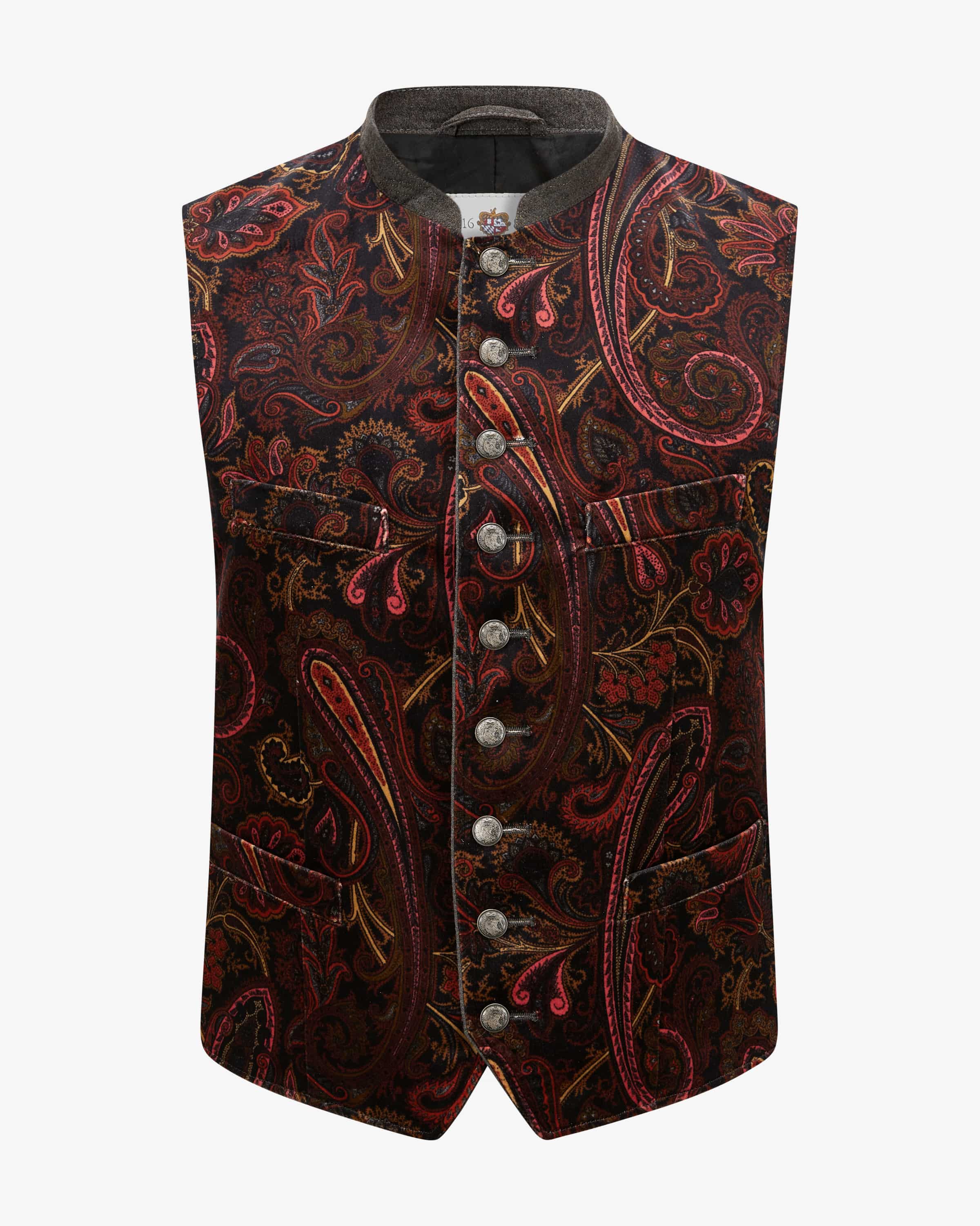 Lorenz traditional vest for men from Meindl in Oxblood. The model made from high-quality material mix with a slightly elasticated wool back presents itself with traditional charm, which is stylishly accentuated thanks to the coin buttons and the velvet stylishly underlined. The paisley pattern also adds a special accent.