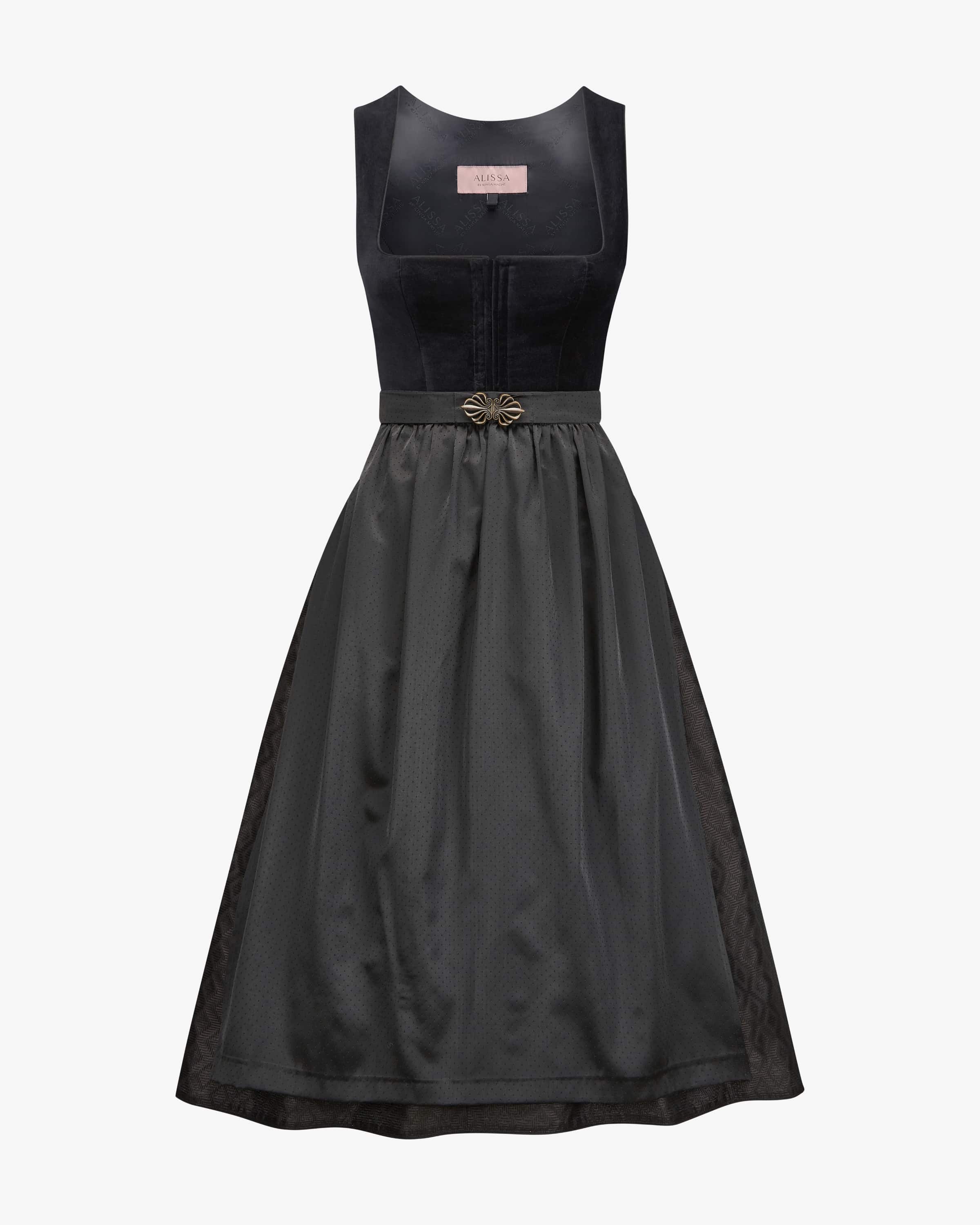 Lumi dirndl long with apron for women from Alissa by Kinga Math in black. With attention to detail, the German label designs elaborate traditional costume creations with that certain something and convinces with an exquisite fabric selection and creative designs. The model convinces with a velvet bodice and and iridescent jacquard skirt, while the underskirt with a flouncy hem lends a feminine fit. The dotted and iridescent apron completes the the traditional look harmoniously.