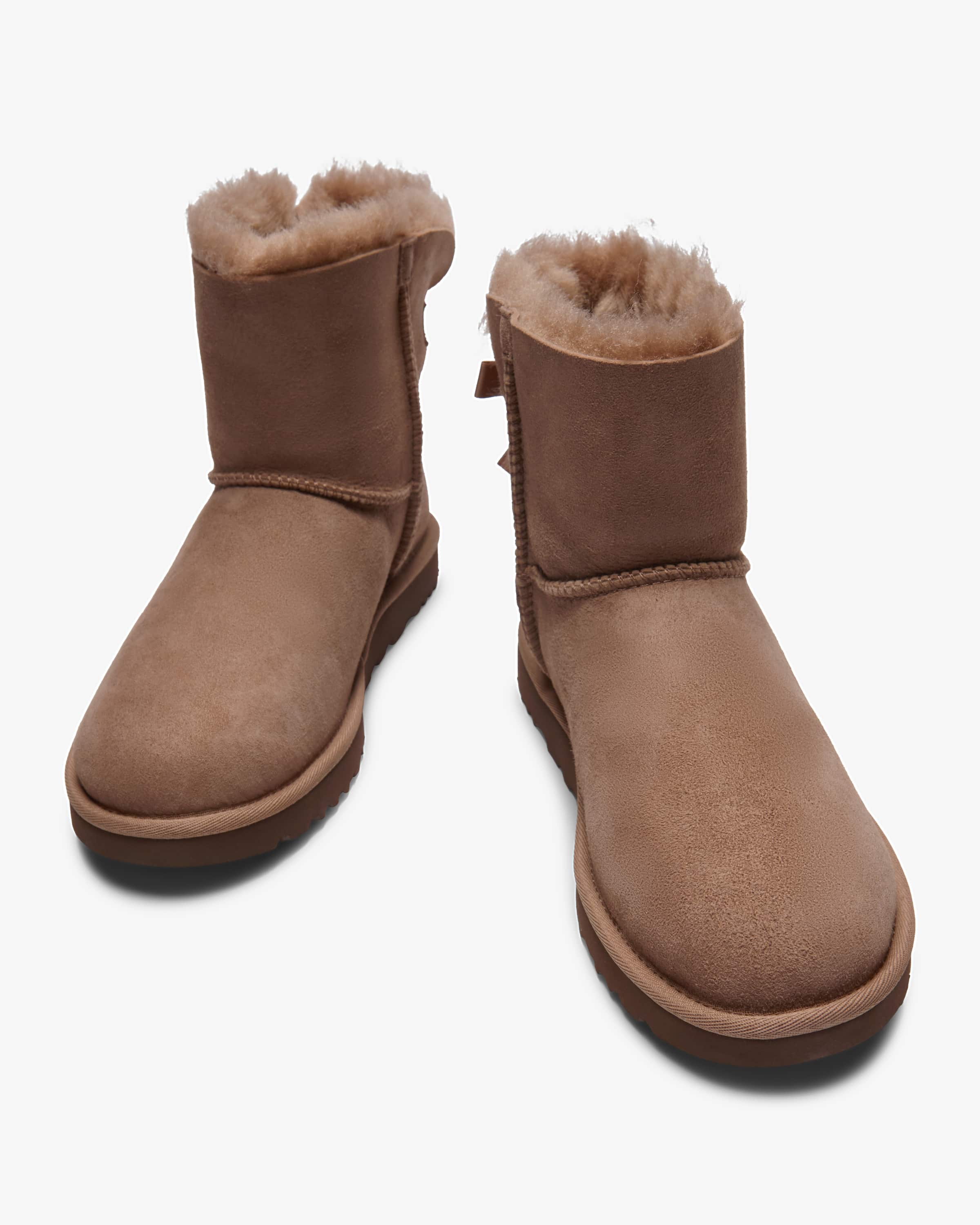 Mini Bailey Bow Boots for women by UGG in lilac. Light, soft and warm - The boots from the cult label impress with their water and dirt-repellent lambskin leather. lambskin leather. Thanks to the characteristic lambskin lining, they provide the necessary warmth while the Treadlite outsole with non-slip tread ensures a secure grip. promises secure grip.