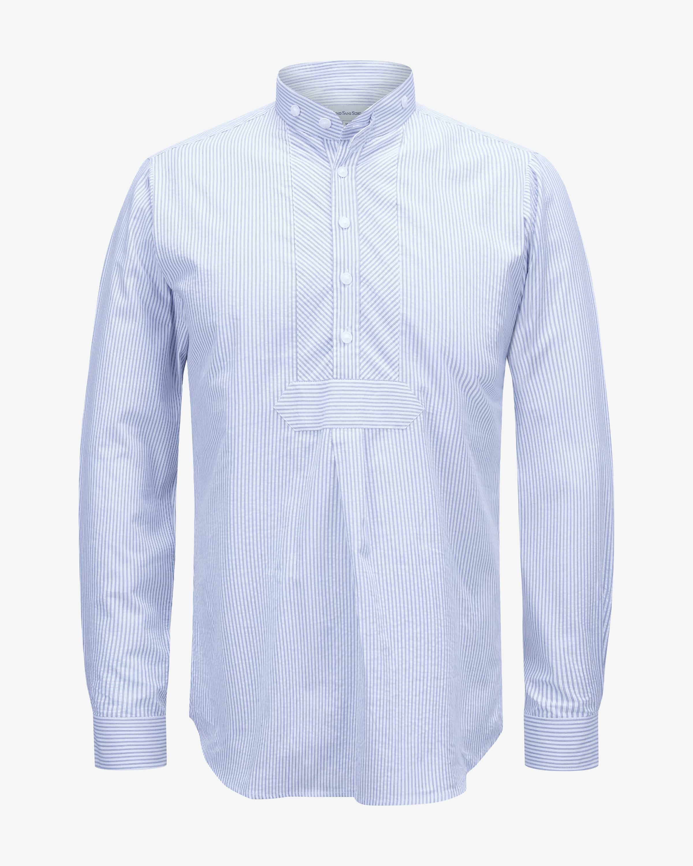 Narrow traditional shirt for men by Hund Sans scho in white and dark blue. The Munich friends founded their label to design contemporary traditional shirts with that that certain something, which are easy to wear and look great at any Oktoberfest or folk festival and offer high wearing comfort. This slim cut summer Pfoad model impresses with its discreet seersucker with a light feel and, together with the striped pattern, lends a modern a modern character together with the striped pattern.