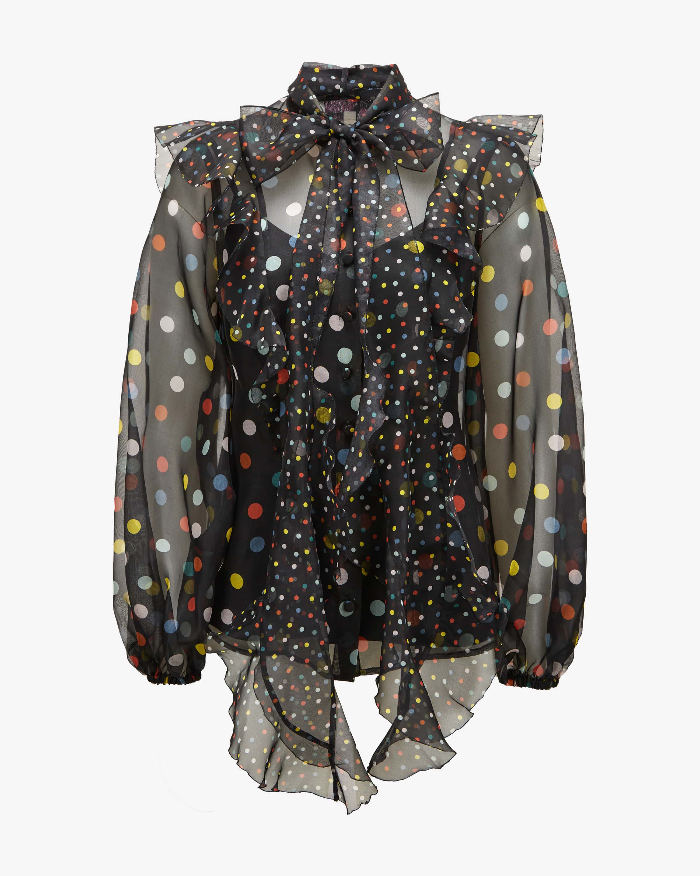 Silk blouse for women from Maison Common in black and colorful. The label embodies joie de vivre and esprit, which can be found alongside feminine charm with colorful designs and patterns in the collections. This wide model impresses thanks to the fine, transparent organza fabric, both as a tactile as both a tactile and visual highlight, while the characteristic characteristic dot print adds a fashionable twist.