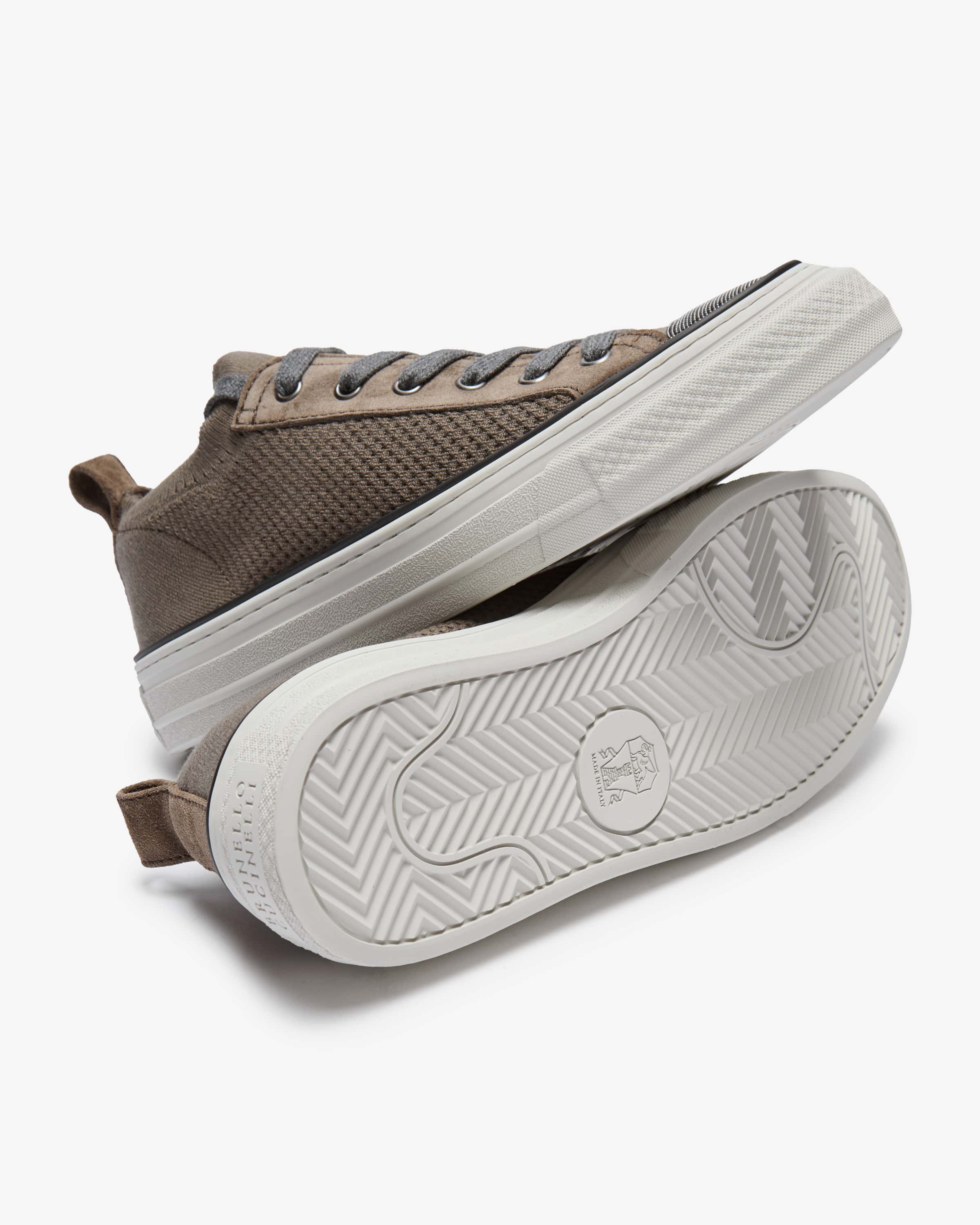 Women's sneakers from Brunello Cucinelli in brown. Made in Italy - thanks to the knitted cotton fabric, this sporty model is particularly comfortable and particularly comfortable and lightweight to wear, while suede details and the characteristic details and the characteristic decorative chain appliqué add a stylish touch.