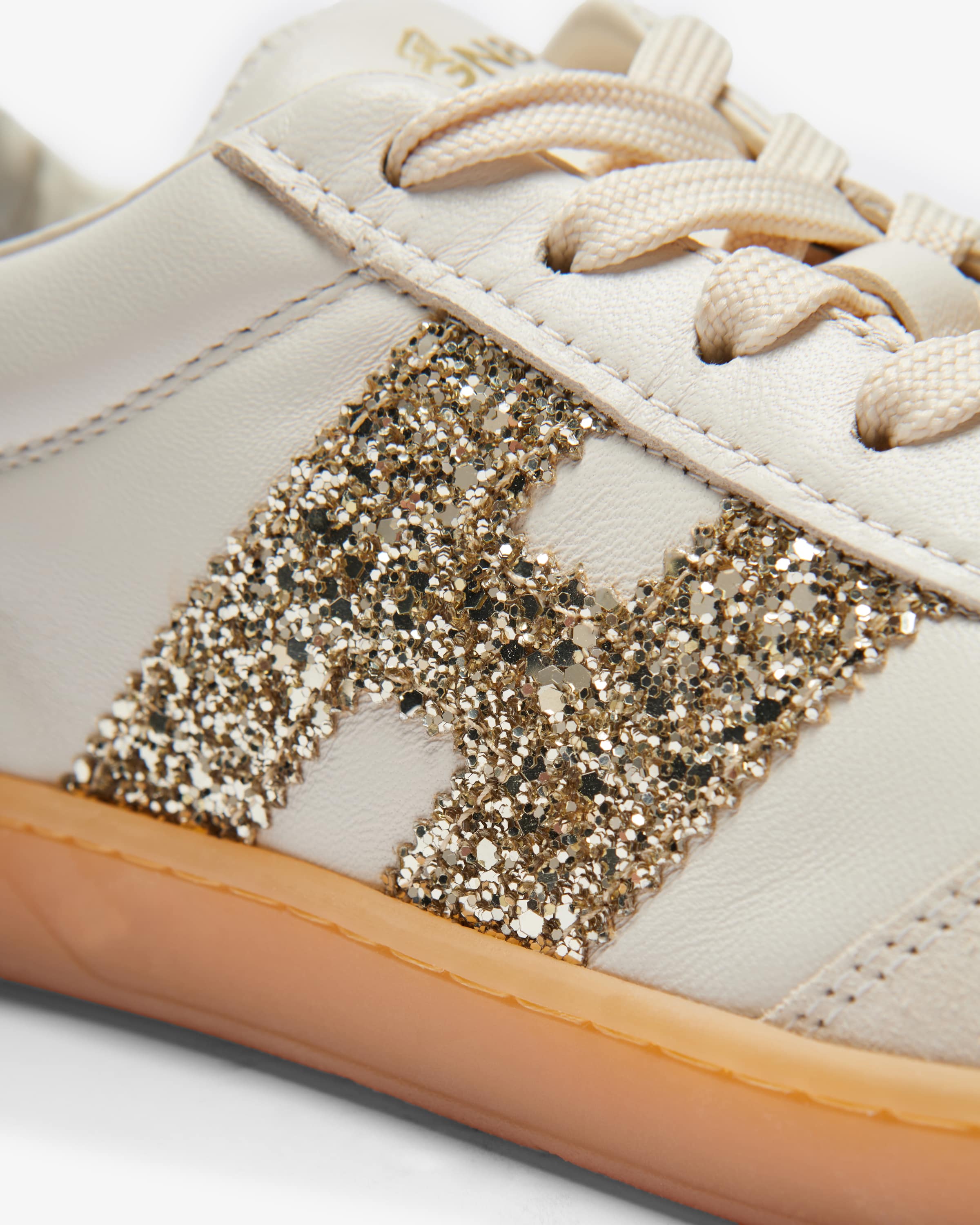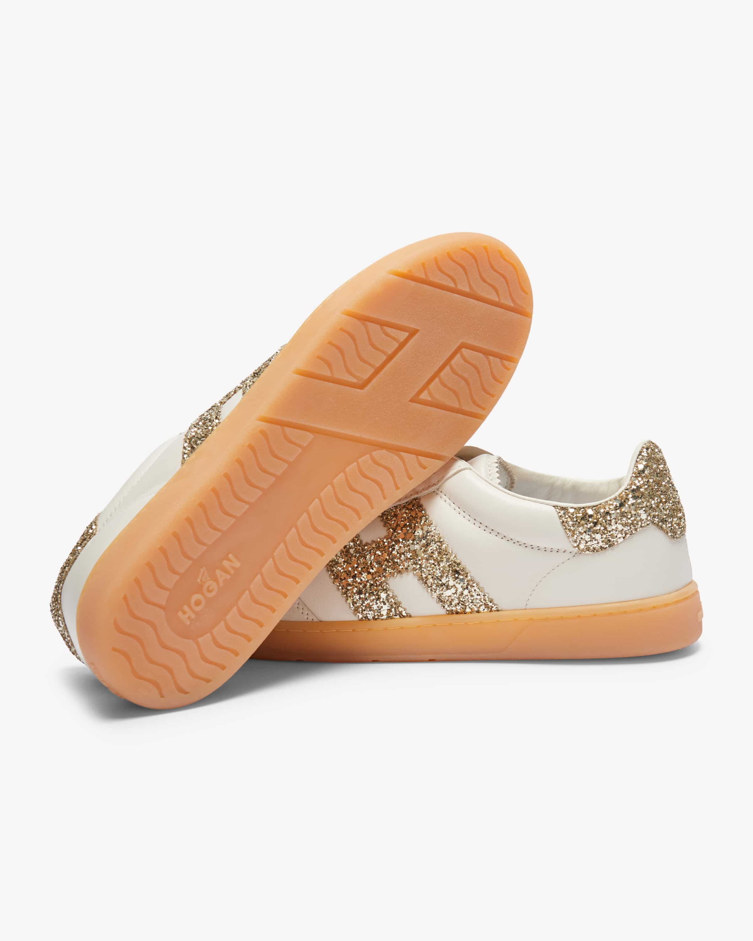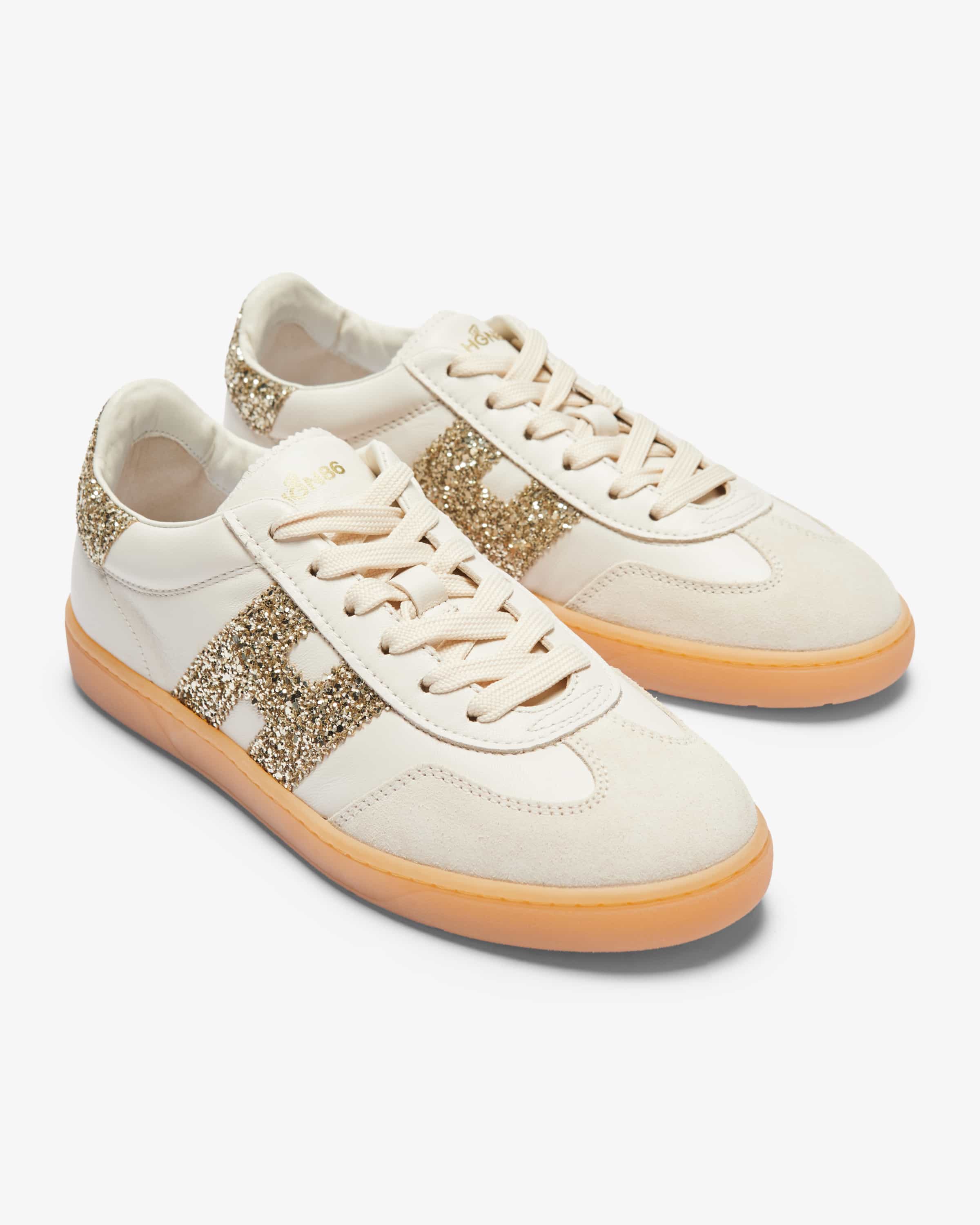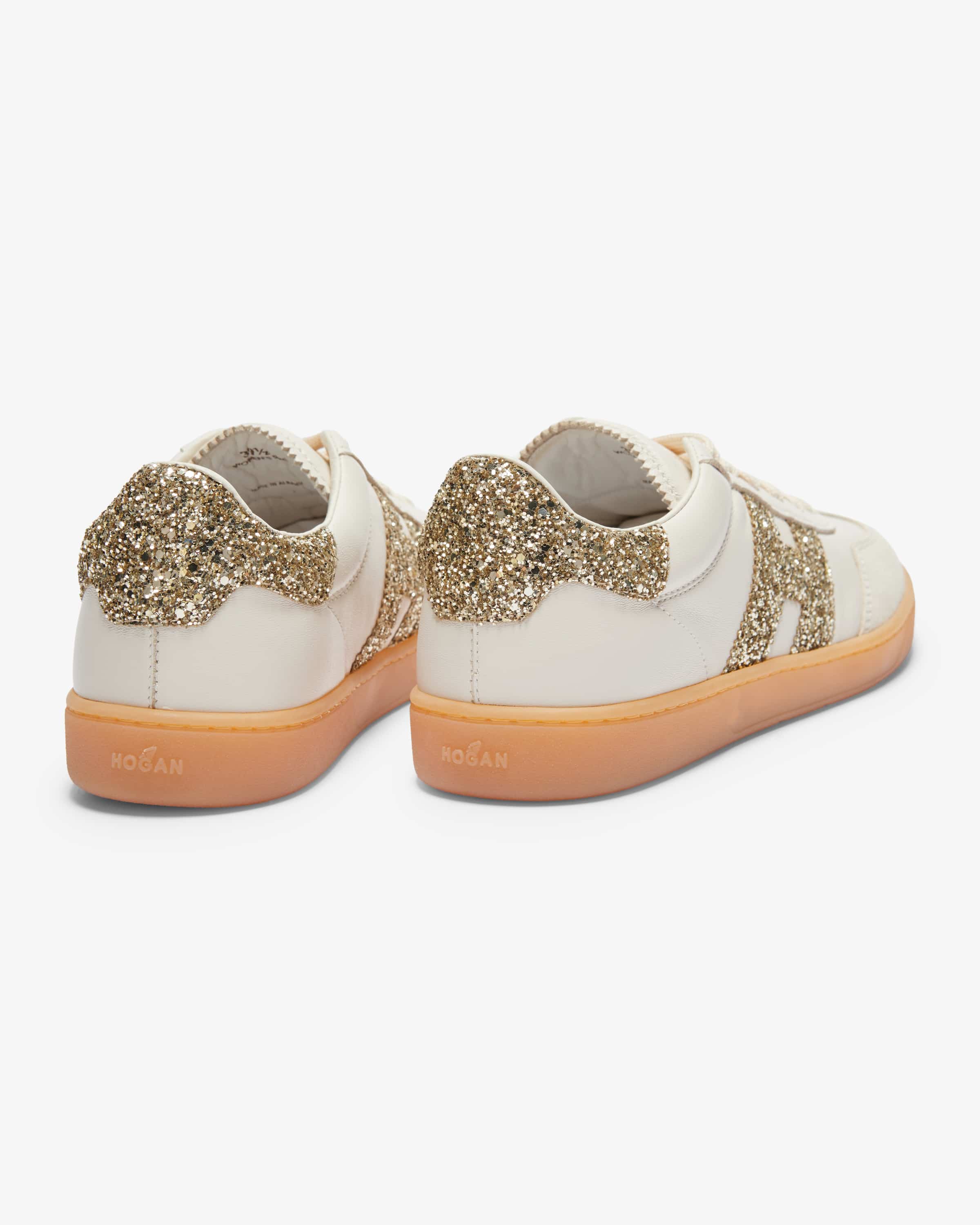 Cool sneakers for women from Hogan in white and gold. The model is characterized harmonious blend of classic, sporty design and iridescent sequins. iridescent sequins, which is skillfully underlined thanks to the contrasting leather mix. At the same time, the softly padded memory foam insole ensures a particularly high level of comfort. wearing comfort.