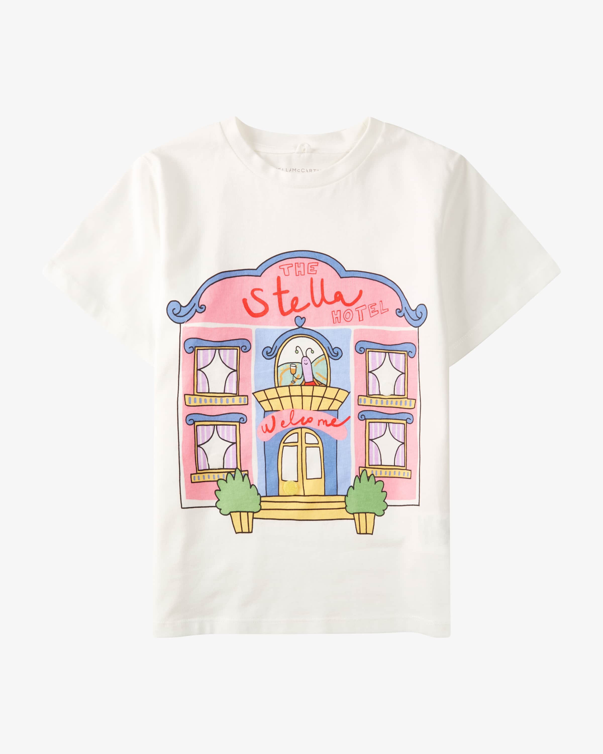 T-shirt for girls from Stella McCartney Kids in white, pink and colorful. Fashion with responsibility - colorful, bold and made from sustainable materials. The style in classic jersey fabric, while the integrated pocket with various Velcro with various Velcro motifs creates individual looks and lends a playful character. character.