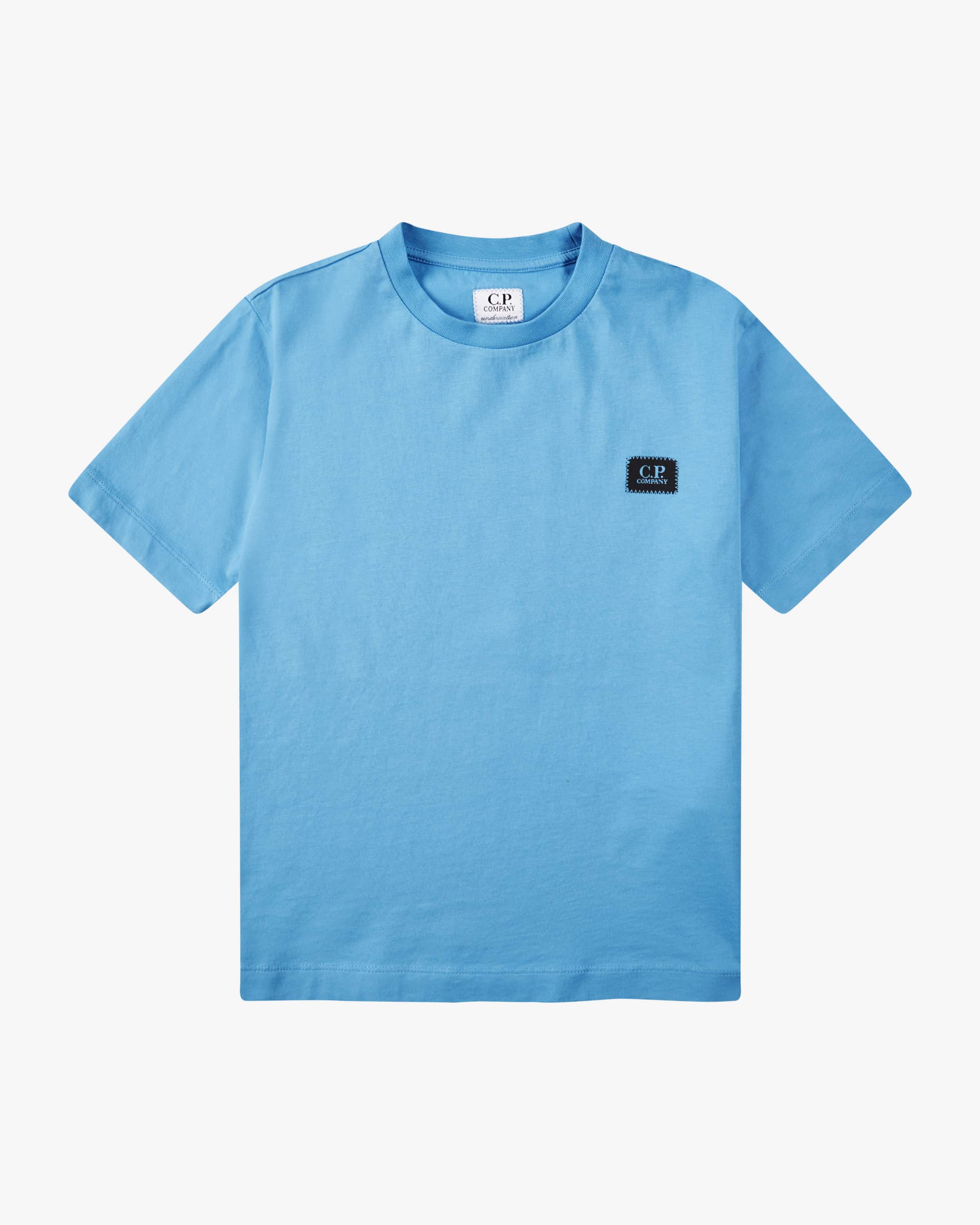 T-shirt for boys from C.P. Company in azure and black. The model impresses as a casual style with logo lettering, while the comfortable cotton fabrication guarantees a high level of comfort.
