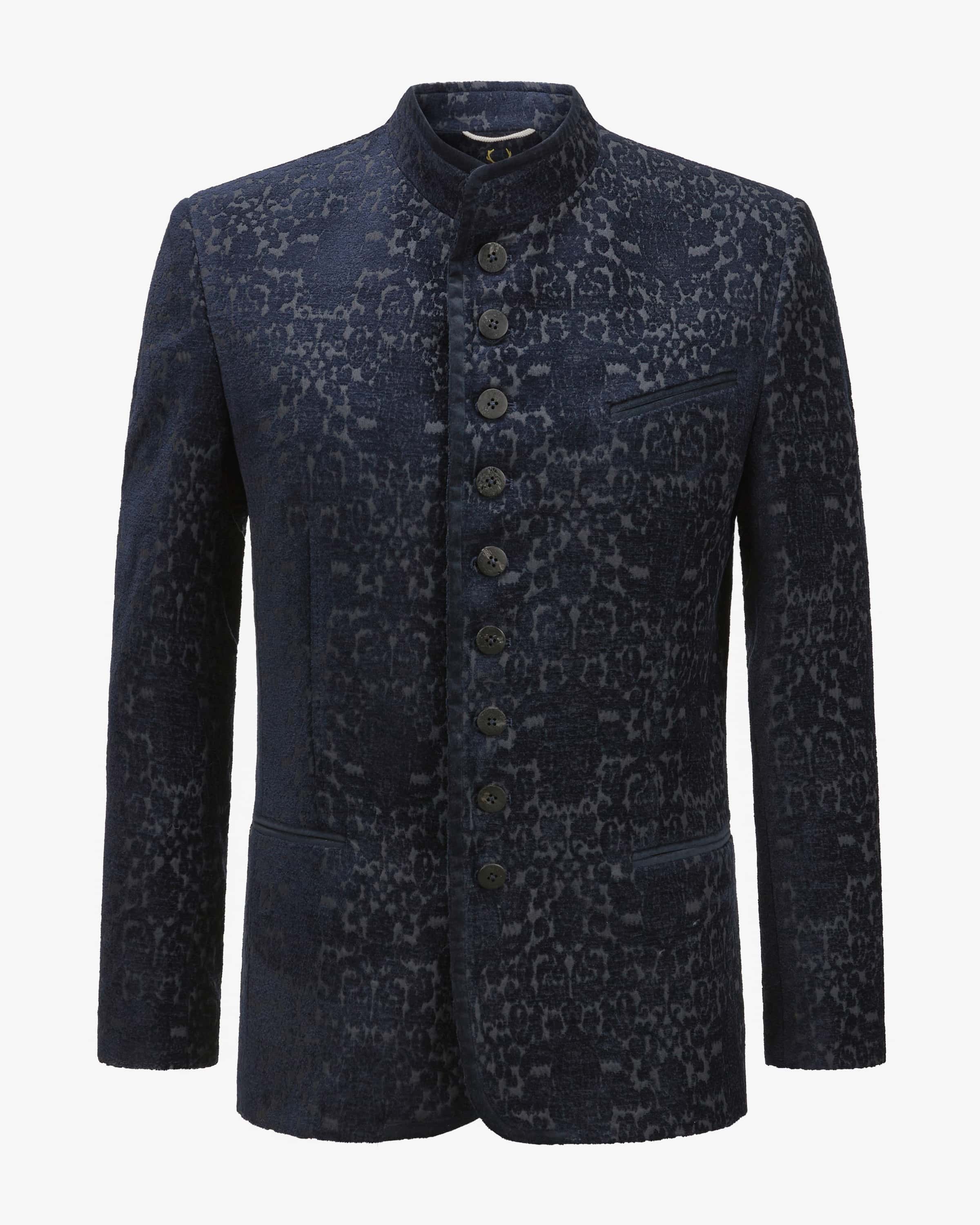 Trachten jacket for men from Mothwurf in navy. This model is characterized by the all-over velvet paisley design and tonal piping. The traditional silhouette with subtle details skilfully rounds off the traditional look.