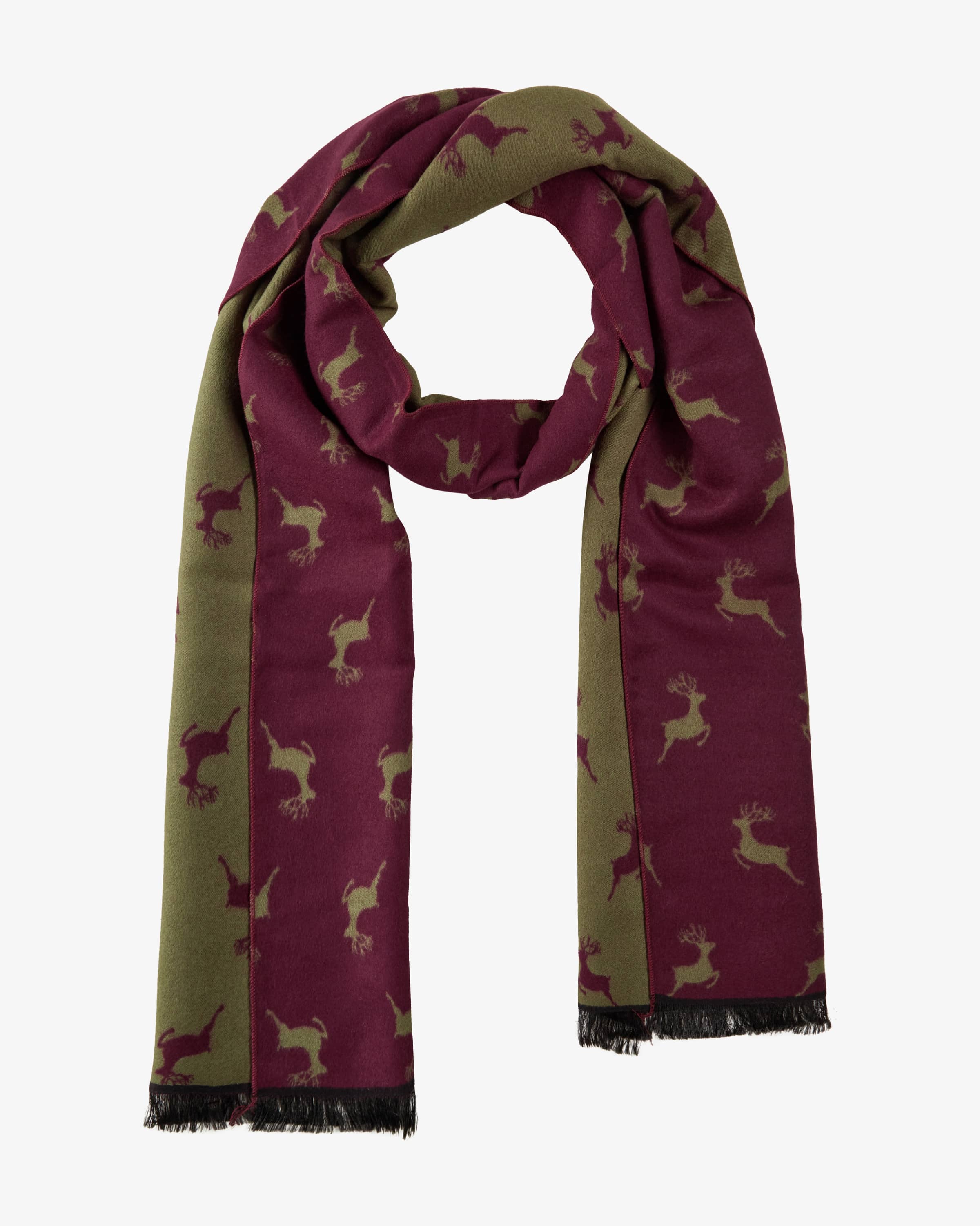 Traditional scarf for men from Luise Steiner in berry and moss green. Traditional Austrian brand for quality traditional costume accessories. Thanks to the soft material processing, the two-sided model has a soft feel, while the traditional stag all-over design creates a modern traditional costume accessory. creates a modern traditional accessory.