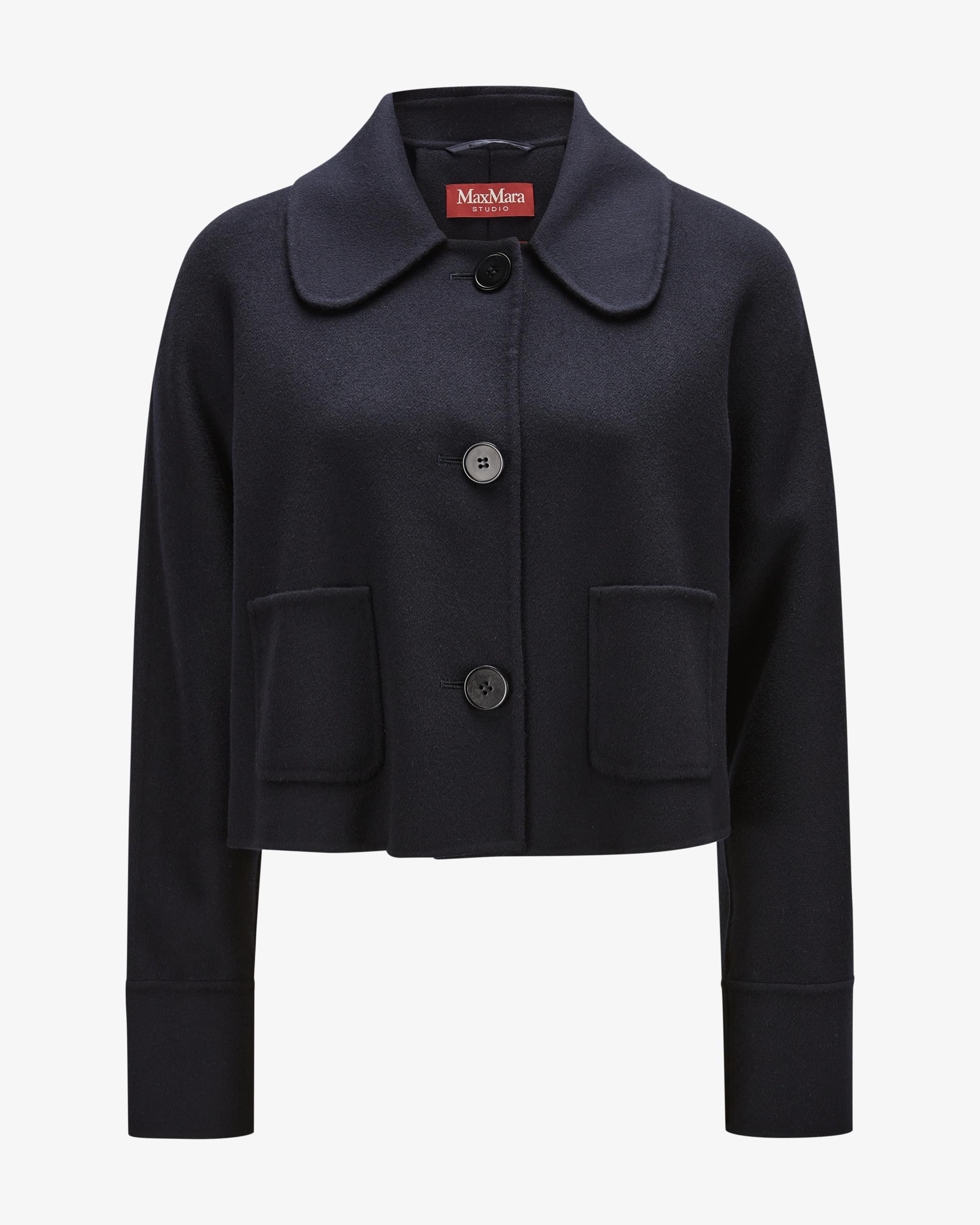 Trionfo wool jacket for women from Max Mara Studio in navy. Feminine, modern, wearable - Max Mara's more feminine line. This model impresses thanks to its high-quality virgin wool blend with silk and cashmere for a particularly soft feel, while the cropped cut with a striking box pleat creates a fashionable companion for the transitional season.