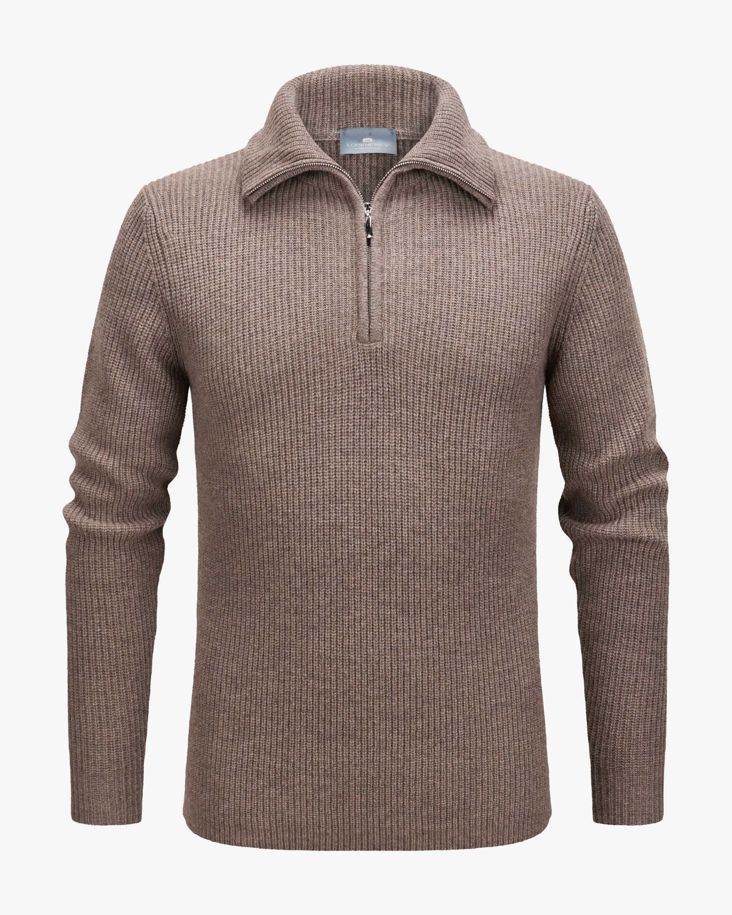 Troyer for men from LODENFREY in taupe. The classic ribbed knit pattern and high-quality the high-quality virgin wool finish create a tactile highlight, while the fashionable troyer design creates a stylish overall look with masculine charm. with masculine charm.