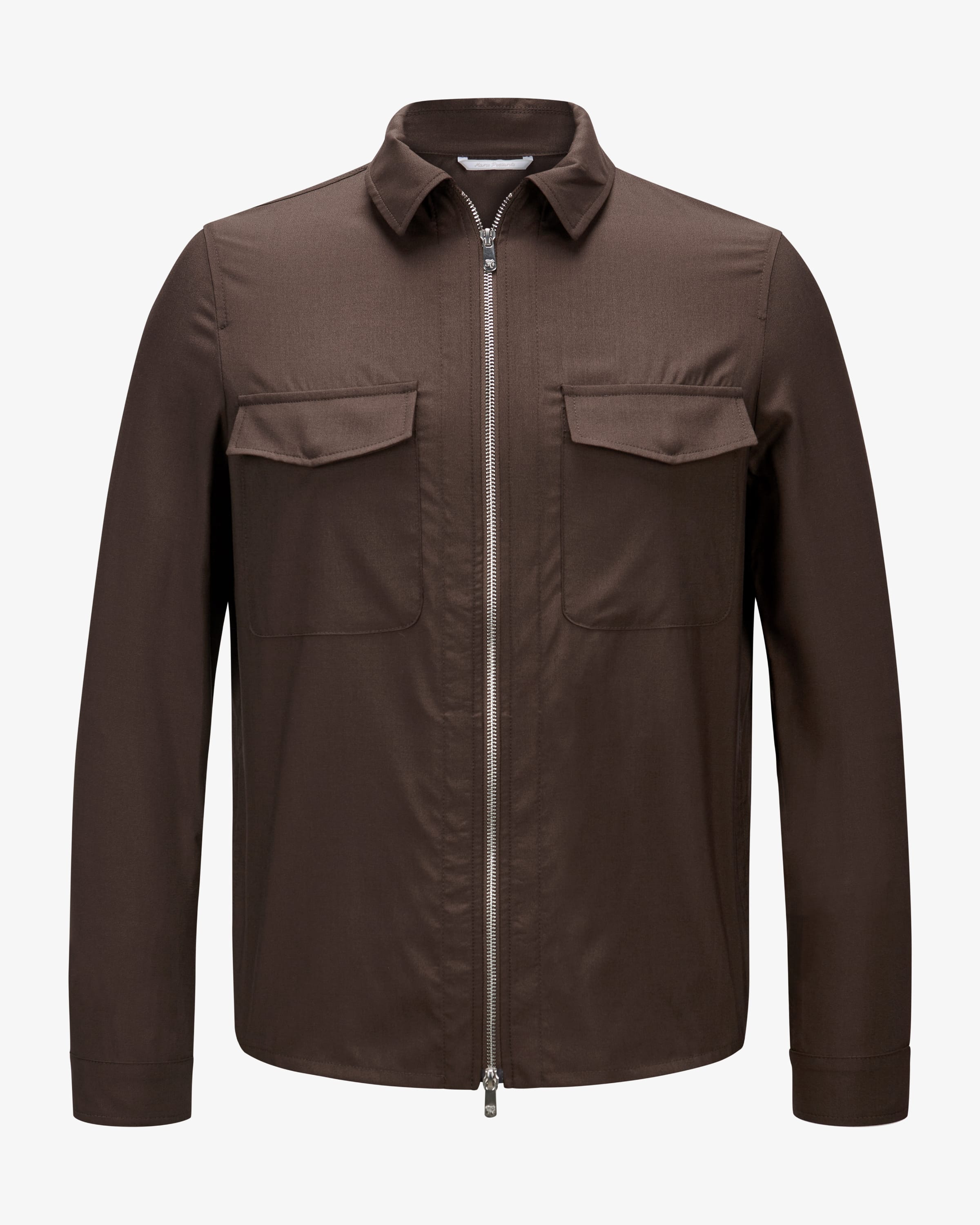 Urus shirt jacket for men from Marco Pescarolo in chocolate. The luxury sportswear model in a modern cut impresses with its lightweight yet high-quality high-quality virgin wool and silk blend in a smooth quality, while the combination of blouson blouson design and shirt details create a modern travel companion.
