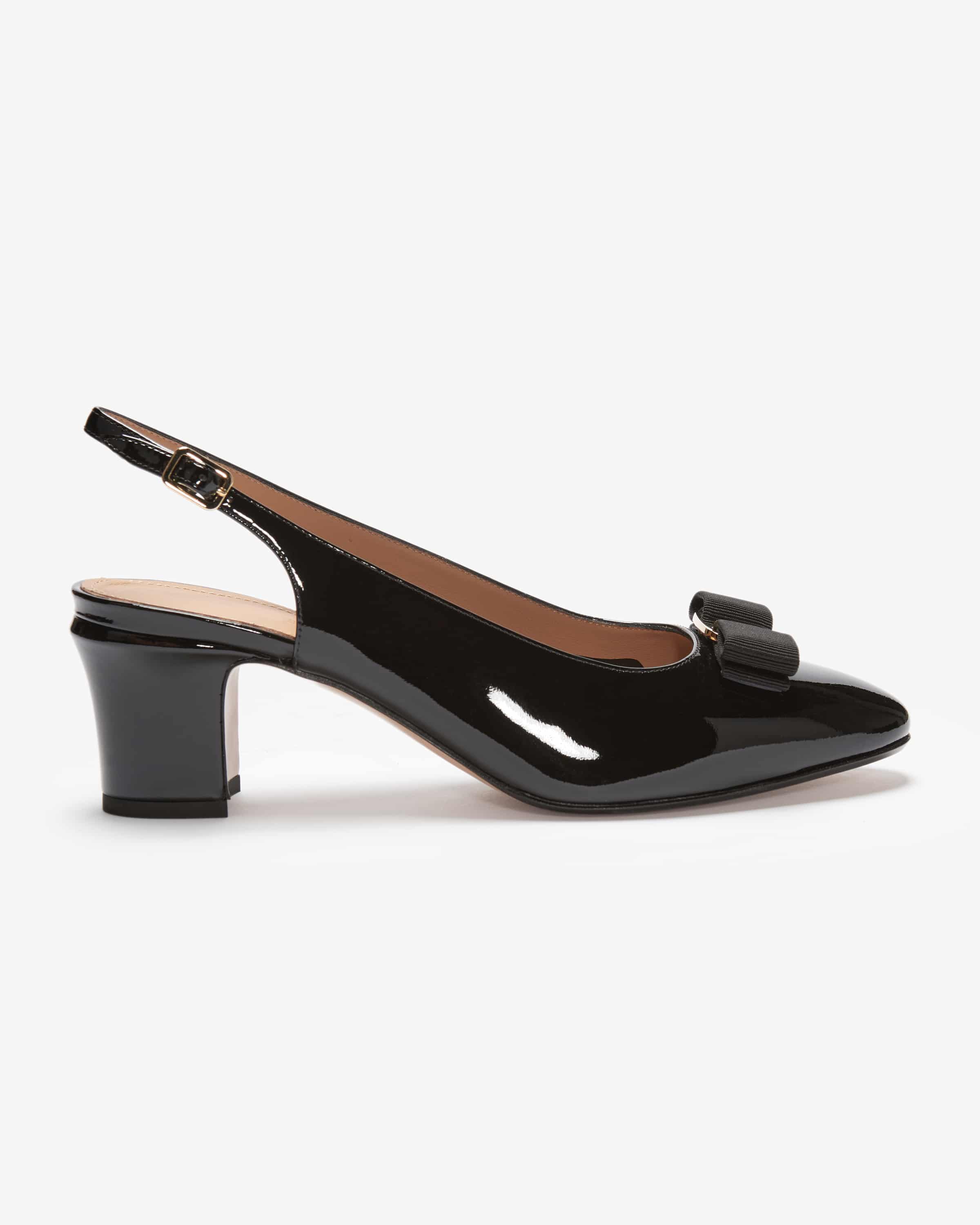 Sling Pump Vetty for women from Ferragamo in black. Founded in 1927, the brand from Florence combines craftsmanship, innovation and classic elegance. elegance. Thanks to the stylish patent leather design and the stable block heel, this model block heel, the model impresses with both a sophisticated look and a high level of comfort, which the adjustable slingback strap and bow appliqué skilfully round off. round off the look.