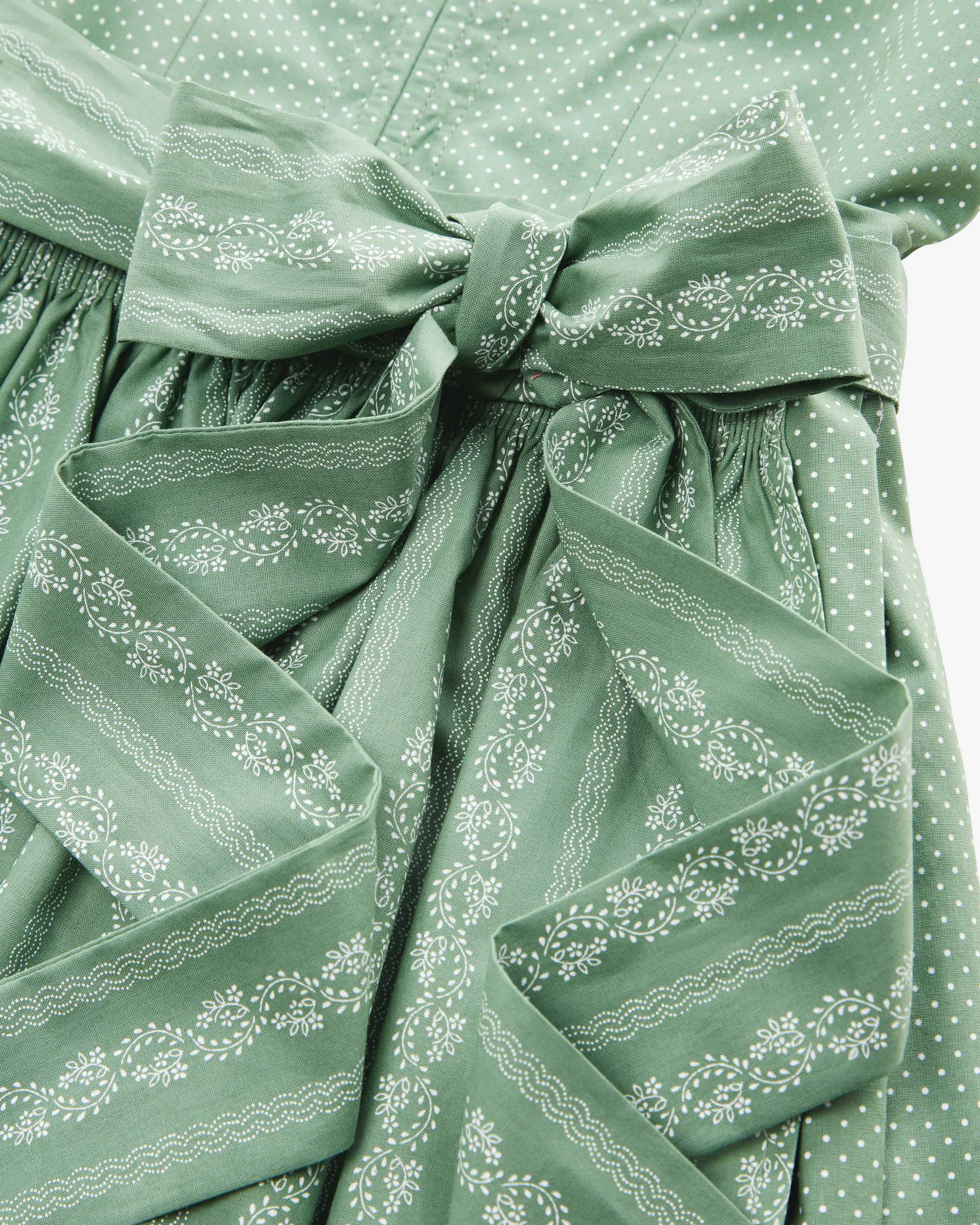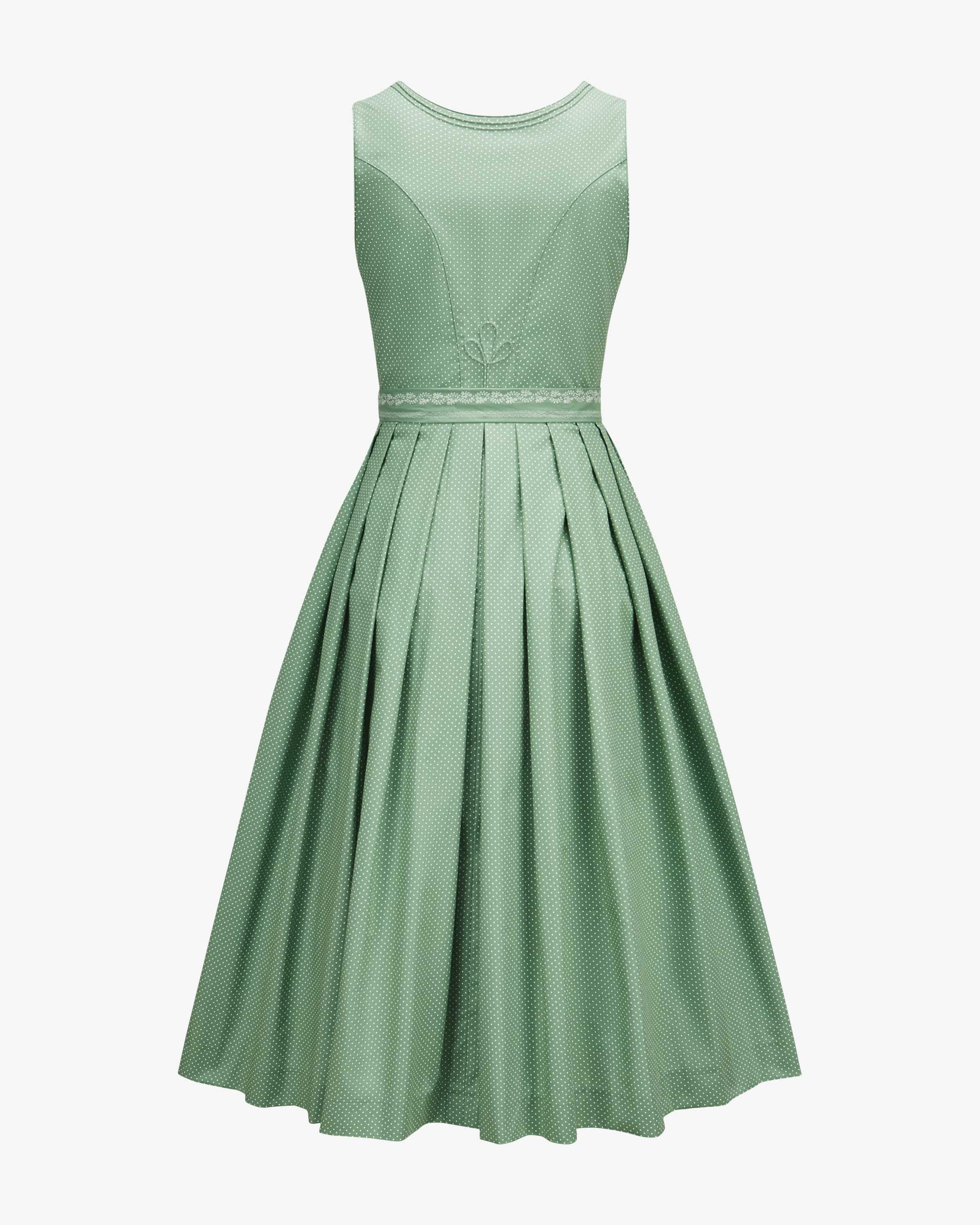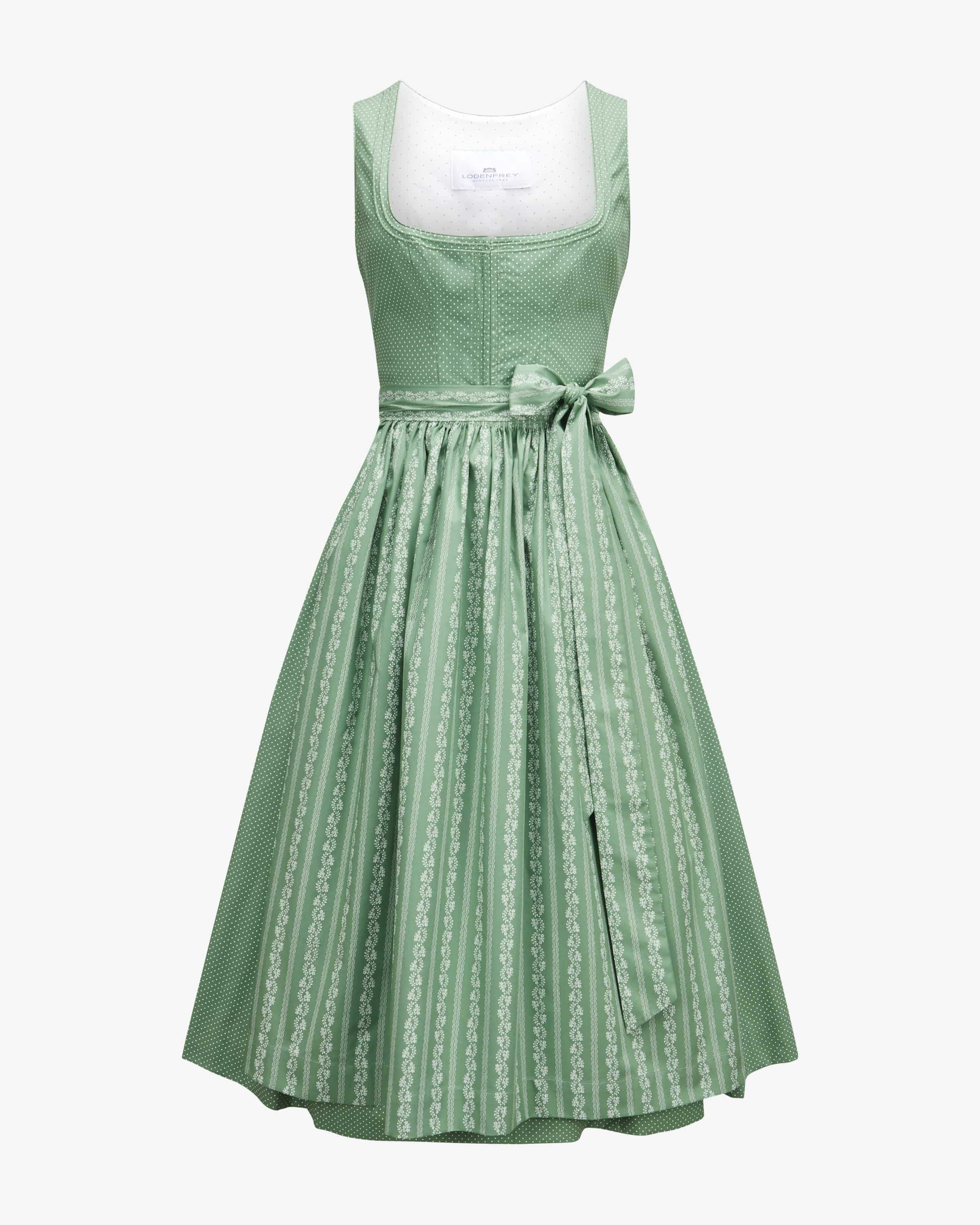 Long Oktoberfest dirndl with apron for women from LODENFREY in light green and white. Thanks to