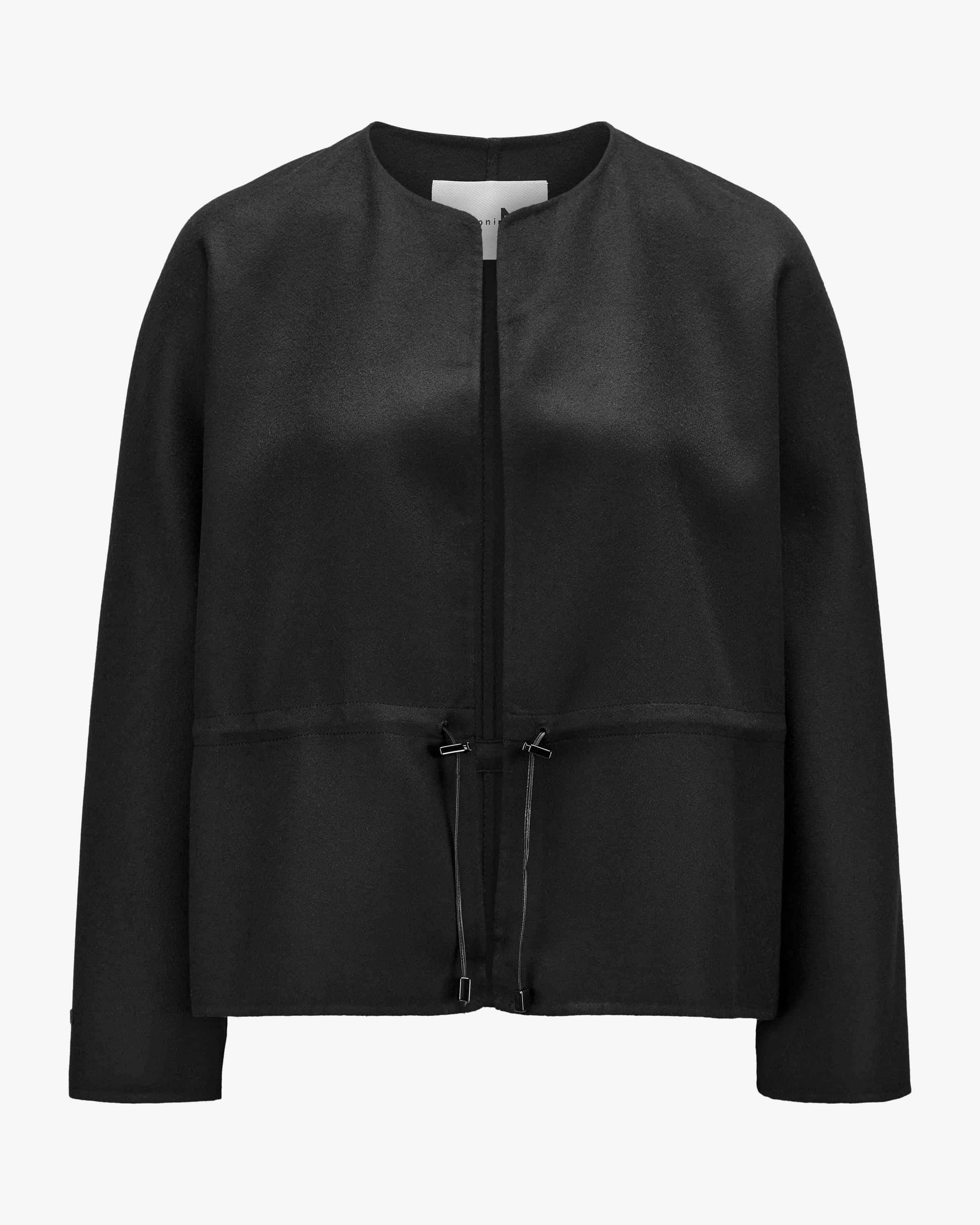 Wool jacket for women from Manzoni 24 in black. Cashmere, leather & fur with modern design - understated & elegant. With this model, the label has created a luxuriously light jacket companion made from high-quality Loro Piana wool which is given a special touch by the open fastening and the drawstring waist. a special touch.