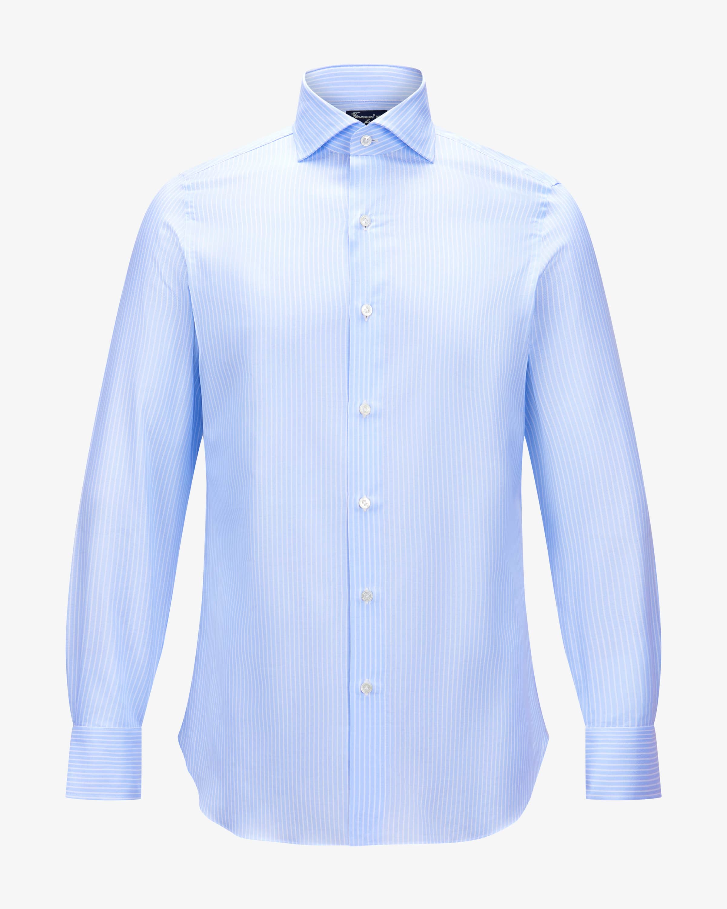 Napoli Eduardo Slim business shirt for men by Finamore 1925 in light blue and white. white. Neapolitan shirt manufacturer with over 100 years of tradition - hand-sewn & individual. With a tailored cut and classic details, this shirt is a convincing as a stylish partner for sophisticated business looks, while the striped design design adds a special touch.