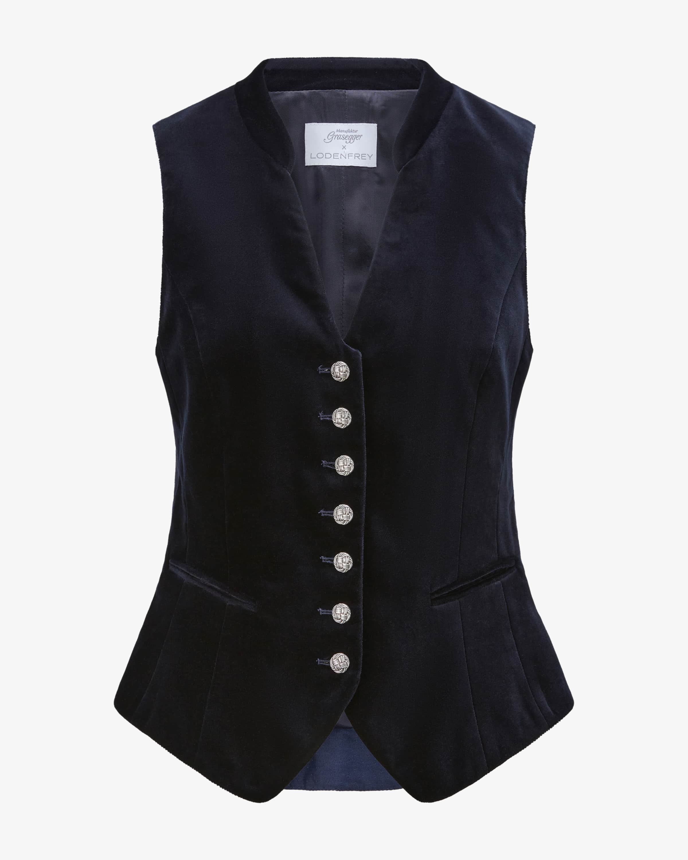 Veronika 2 Trachtenweste für Damen von Grasegger in Marine. Das taillierte Modell aus der exklusiven Kollaboration mit Lodenfrey überzeugt dank weicher Samt-Vorderseite in stilvoller Aufmachung, welche durch die raffinierten Knöpfe in geflochtener Optik sowie die Abnäher-Details mit traditionellem Charme vollendet wird - Ein maskuliner Klassiker feminin interpretiert.